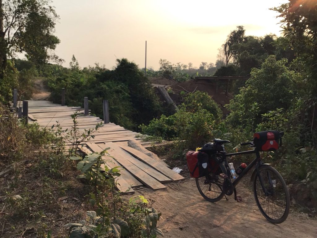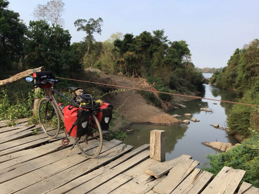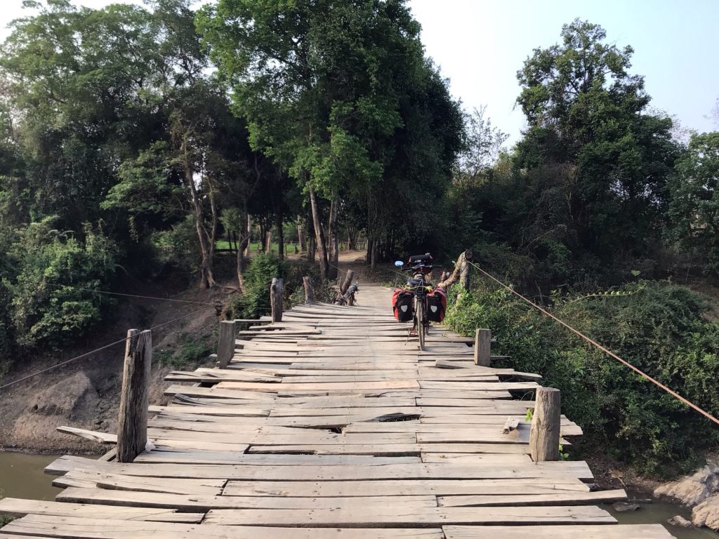 Et puis, il y a aussi les vieilles passerelles à franchir. Sans elle, aucune autre possibilité de continuer ma route longeant le Mékong que l’on aperçoit au fond.
