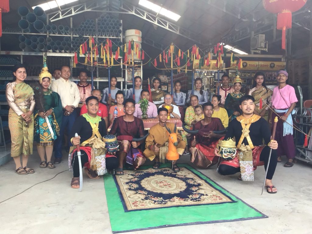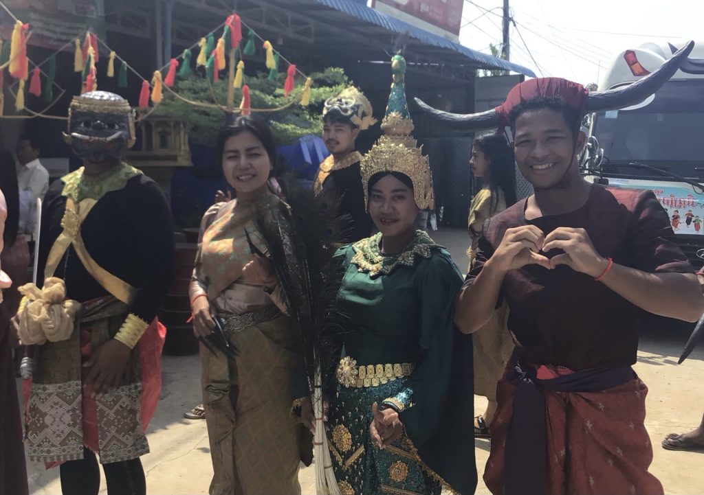 Après la représentation, le papa en rouge qui m’a autorisé à filmer, les jeunes mariés, la moniale, la maman et la sœur de la mariée remercie les acteurs.