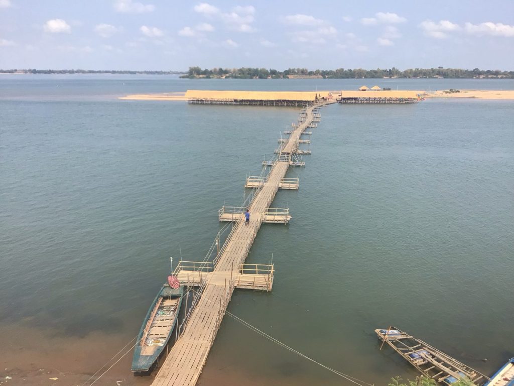A l’entrée de Sambor, une longue passerrelle permet d’accéder à un village de pêcheurs qui ont installé un système de nasse à poissons. Le petit gamin bleu s’y rend.