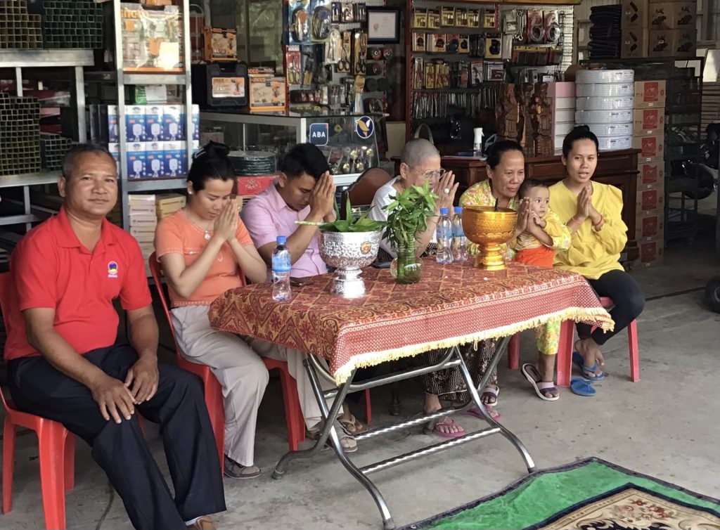 Je continue mon chemin. De temps en temps, un marchand ambulant, klaxon hurlant, débarque dans un hameau. Il vend des sachets de légumes, de fruits ou de friandises. J’achète un sachet (500KHR le sachet soit 0,10€) contenant 6 boules de riz-coco mélangés. Cela me fera mon p’tit déj’ en complément de mes bananes matinales. Les drôles sont toujours autant surpris de nous voir débarquer avec Haka2. A ce sujet, mon compagnon se comporte magnifiquement sur ce terrain pas spécialement propice à ses aptitudes.