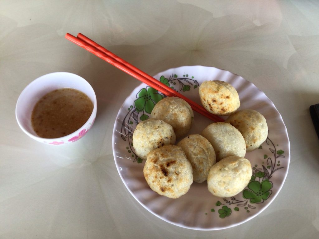 Mais, comme il est encore tôt, je décide de prolonger un peu ma route avant de déjeuner. Et cela me permettra aussi de sécher. Quelques kms plus loin, je tombe sur des gargotes qui font chauffer de gros escargots verts. Je tenterais bien l’expérience mais j’ai un peu de mal avec la viande depuis quelques jours. Tant pis. Je continue un peu plus loin et je trouve une femme qui confectionne ces petites boules à partir d’une pâte. C’est fourré, servi avec une sauce sucré-salé. Je me régale. Cela fera mon repas.