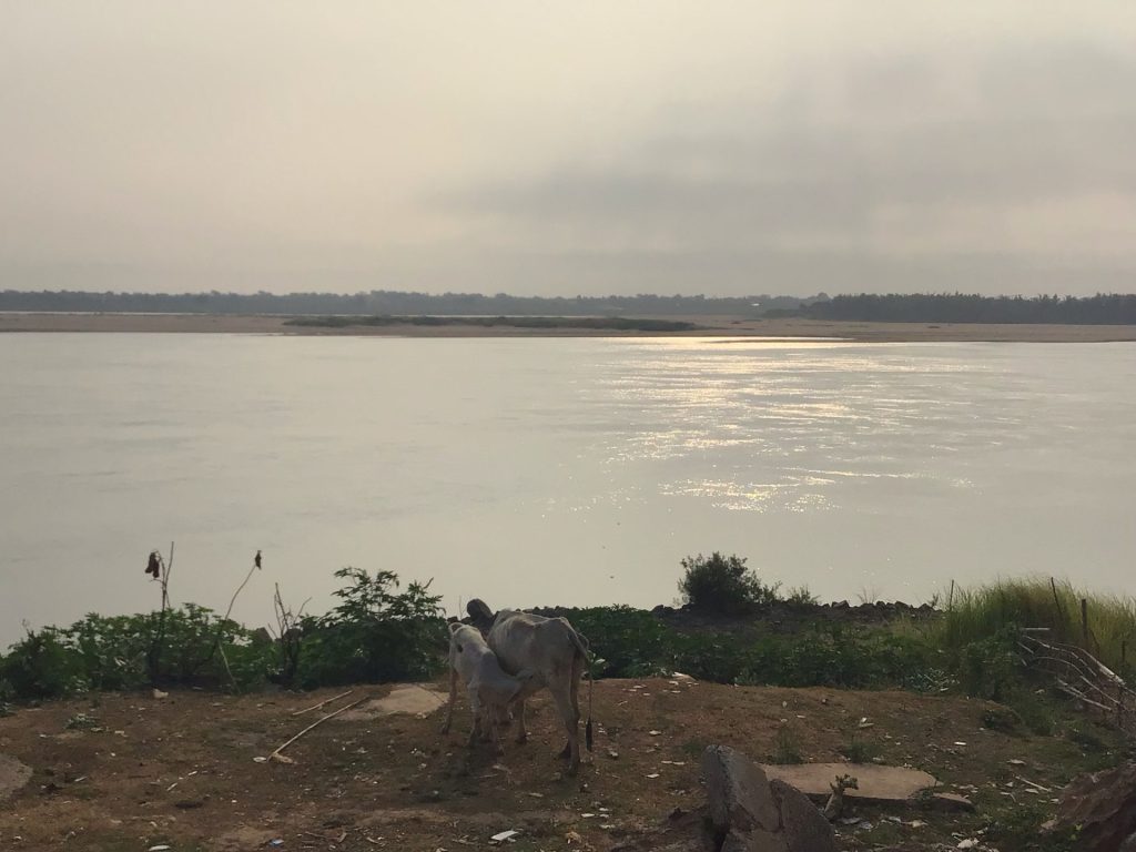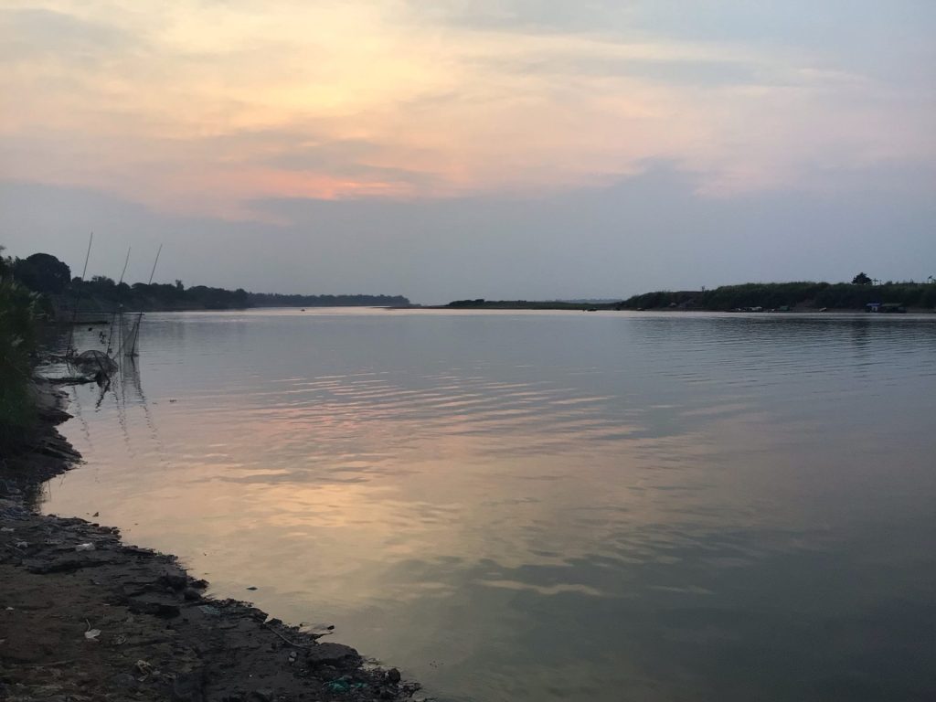 Je roule bon train pour arriver vers 14h00 à destination. Après avoir visité une GuestHouse non répertoriée et tenu par un chinois pas vraiment sympa aux chambres miteuses, je file jusqu’à l’adresse repérée. Ce n’est pas terrible non plus mais ça ira. De toute façon, je n’ai pas trop le choix. Je me pose et fais un gros siestou sous ventilo. Puis je pars à la découverte de cette bourgade campagnarde. J’arrive, non sans mal, à dégoter un kiosque où commander un café glacé à emporter. Contrairement à hier, je ne trouve aucun endroit où me poser. Je file vers le fleuve pour me poser sous un arbre.