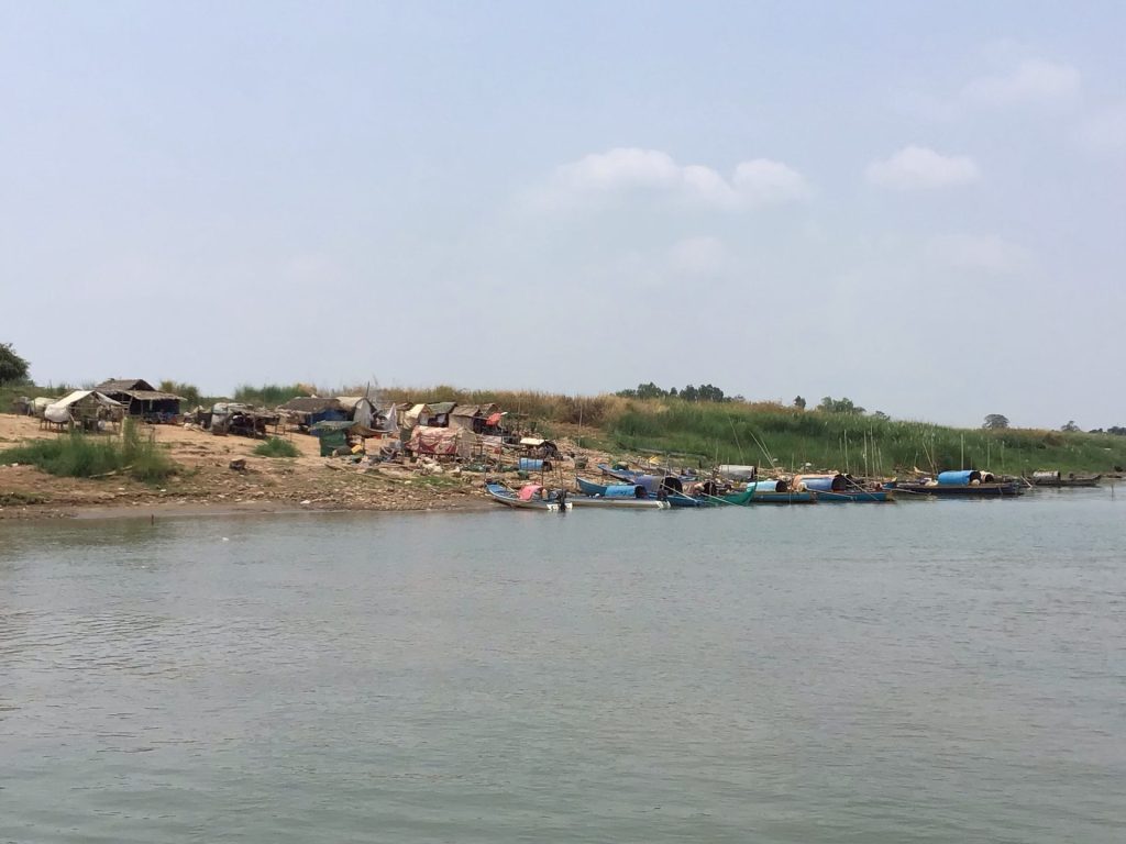 C’est à mon tour d’embarquer toujours au grand étonnement des autochtones. Au milieu du fleuve, nous croisons l’autre traversier très peu chargé. A 1000KHR, il doit falloir en faire des traversées pour rentabiliser l’opération.