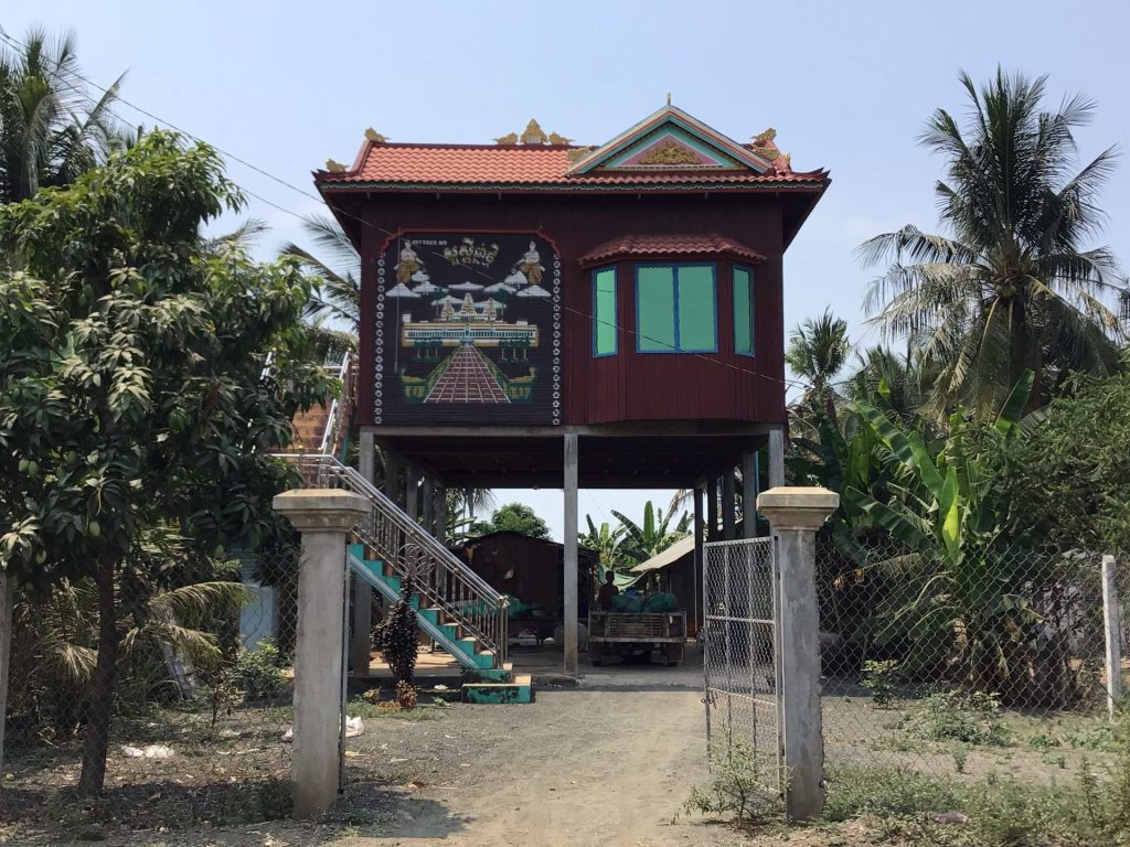 Alors que j’arrive à mon embarcadère, je fais un nouvel arrêt pour photographier cette belle bâtisse sur pilotis typique de ces maisons construites le long du fleuve. Celle-ci a la particularité d’avoir la fresque du temple d’Angkor Wat sur sa façade.