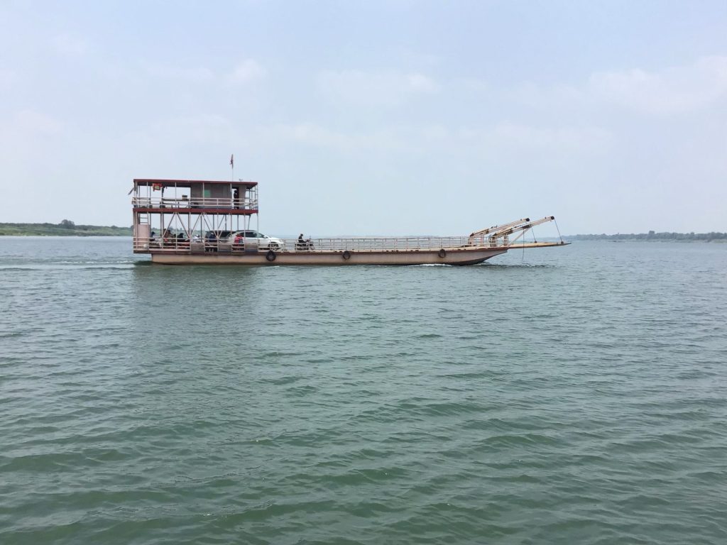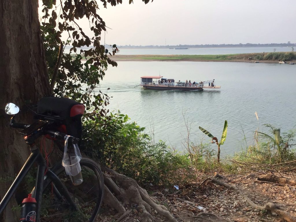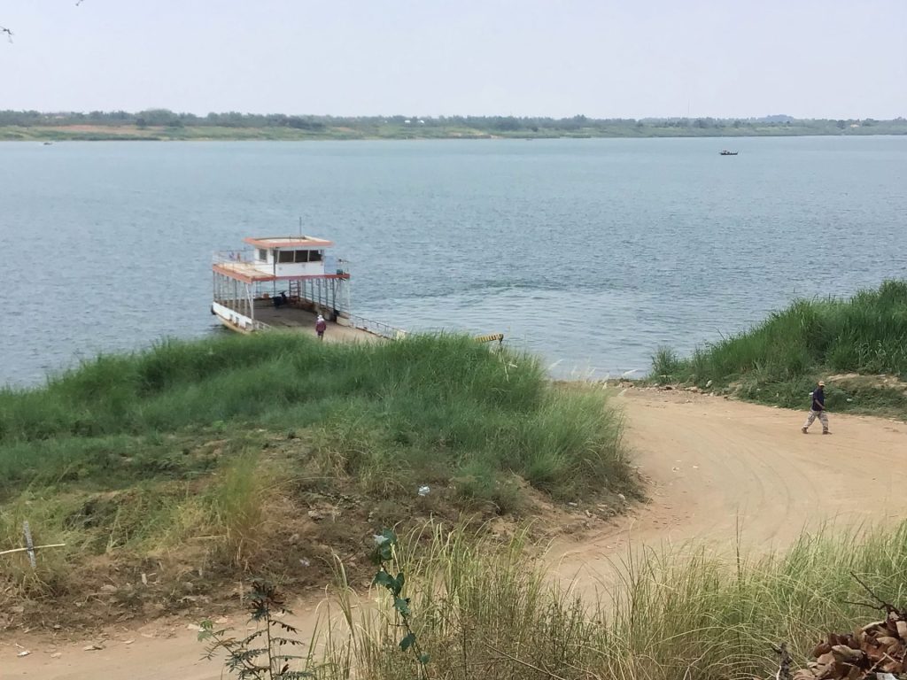 Avant de traverser le village de Kang Meas, je descends par un méchant chemin sablonneux jusqu’à l’embarcadère où j’avais planifié de retraverser le fleuve pour arriver rive gauche à la capitale. Le traversier vient juste de finir de déverser son flot de voiture, scooters et passagers.