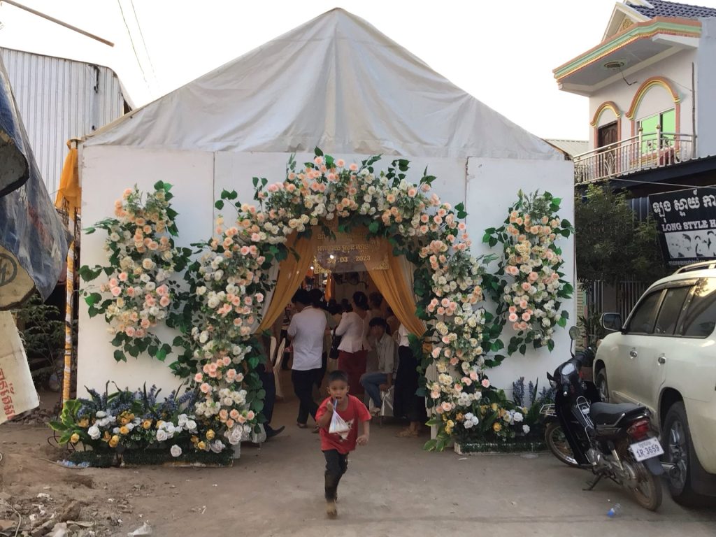 Il est plus de 17h00. Le dernier traversier entre au port. Quant à moi, je me balade dans ce village. Un mariage s’y tient. Comme souvent, le chapiteau est installé au milieu de la route devant la maison familiale. Ici, il bloque carrément le passage. Mais ça ne dérange personne.