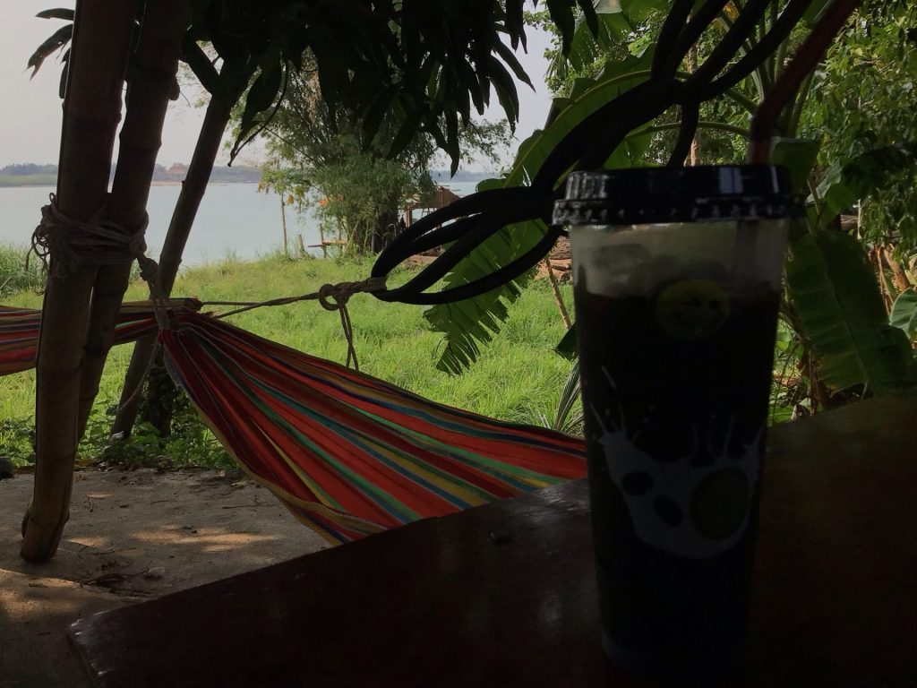 Vers 9h00, l’appel du café se fait entendre. Je trouve un kiosque en bordure de fleuve. C’est parfait. La jeune femme le tient alors que son mari a une plateforme de nettoyage de scooter juste à côté. J’en profite pour faire regonfler mes pneus. C’est l’heure de pause douceur. Une nouvelle fois, les hamacs m’invitent à la paresse. Mais je suis fort et je résiste. Je repars alors que le thermomètre commence à grimper.