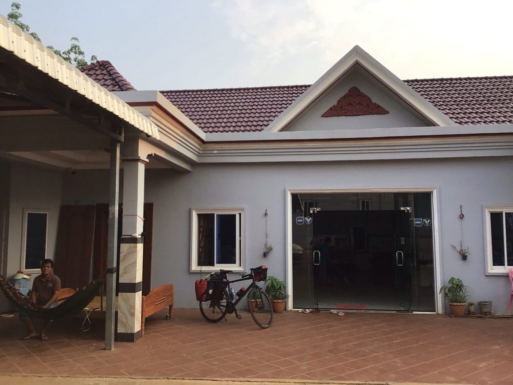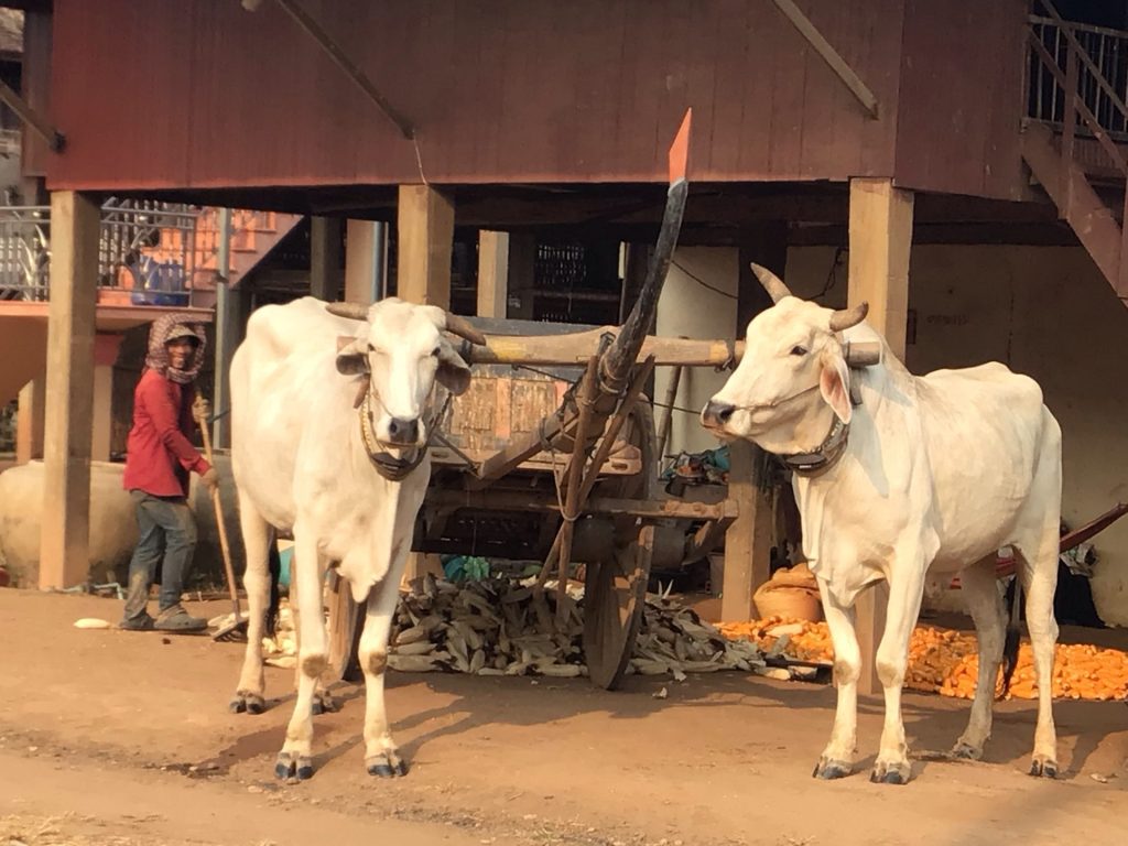 Je traverse à nouveau la ville de Stueng Trang bien animée en ce jeudi matin. Puis je reprends ma charmante petite route longeant le Mékong. Le paysage y est toujours aussi vert. Cela me change de ma traversée désertique d’ouest en est pour rejoindre ce majestueux fleuve.