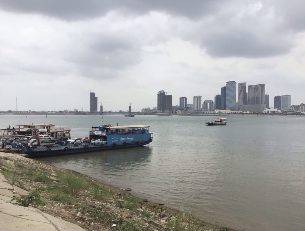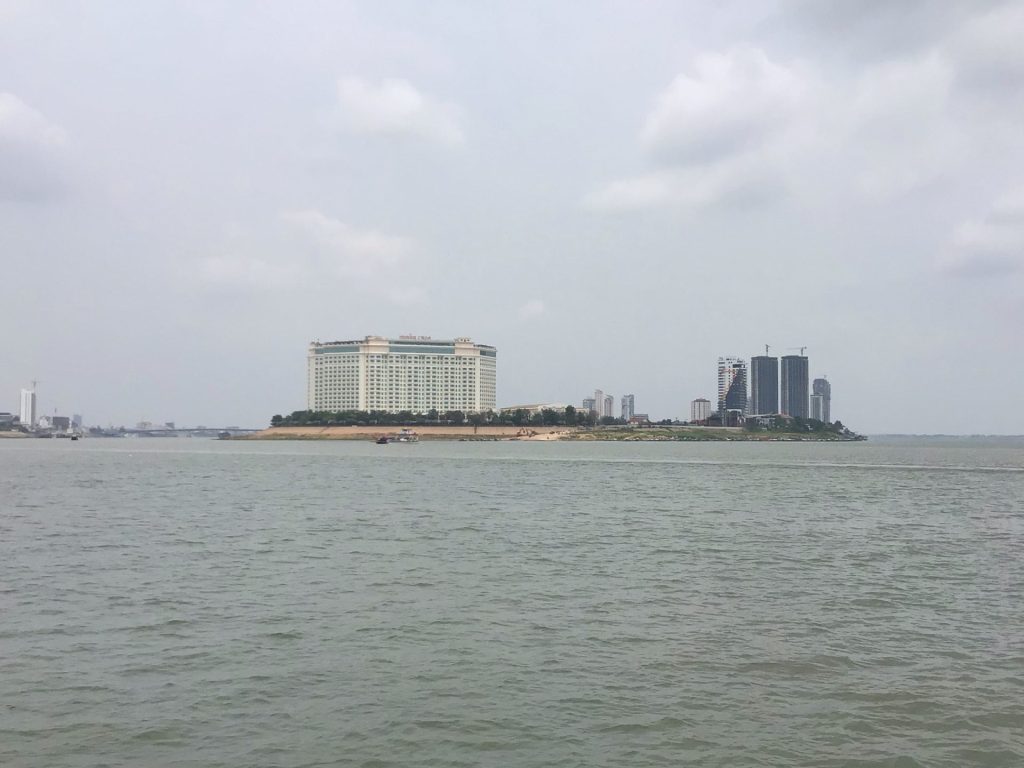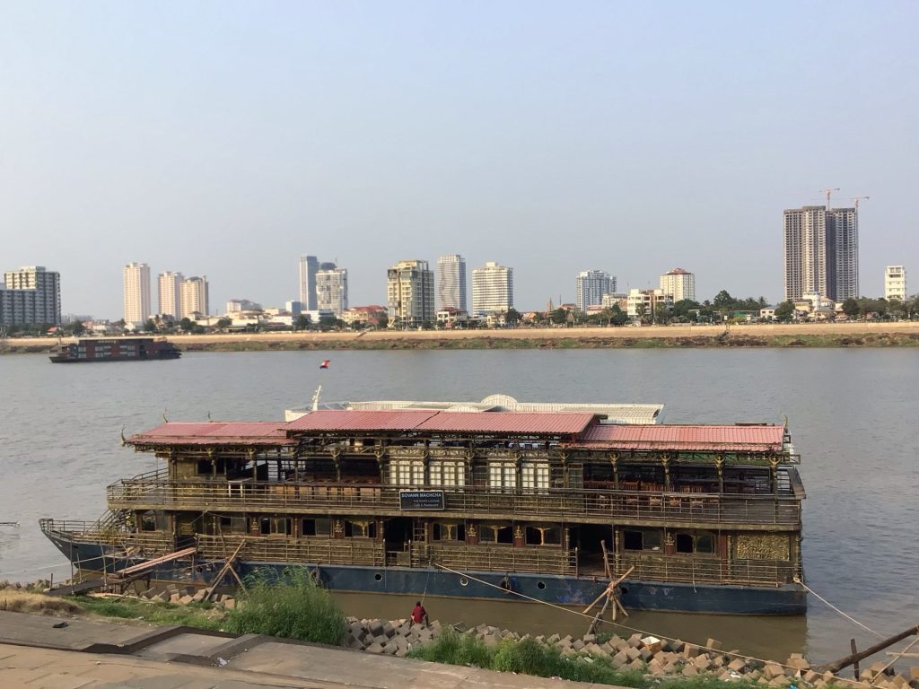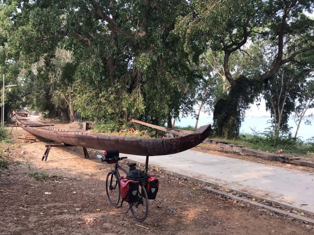 Sur l’embarcadère, je fais connaissance avec un français circulant à VTT. C’est un niçois, ancien militaire, qui est installé sur cette rive depuis quelques années déjà. Il vit avec une cambodgienne, son fils de 19 ans et sa fille de 3 ans. La cohabitation avec ses deux beaux-enfants paraît compliquée. Il est devenu expert en incendie. Il me raconte tout un tas d’anecdotes sur son métier et les personnages importants qu’il côtoie ici. A ce sujet, il m’informe que le grand hôtel construit sur l’île du milieu du fleuve est à vendre; le riche propriétaire, un ancien ministre, n’ayant pas payé ses charges.
