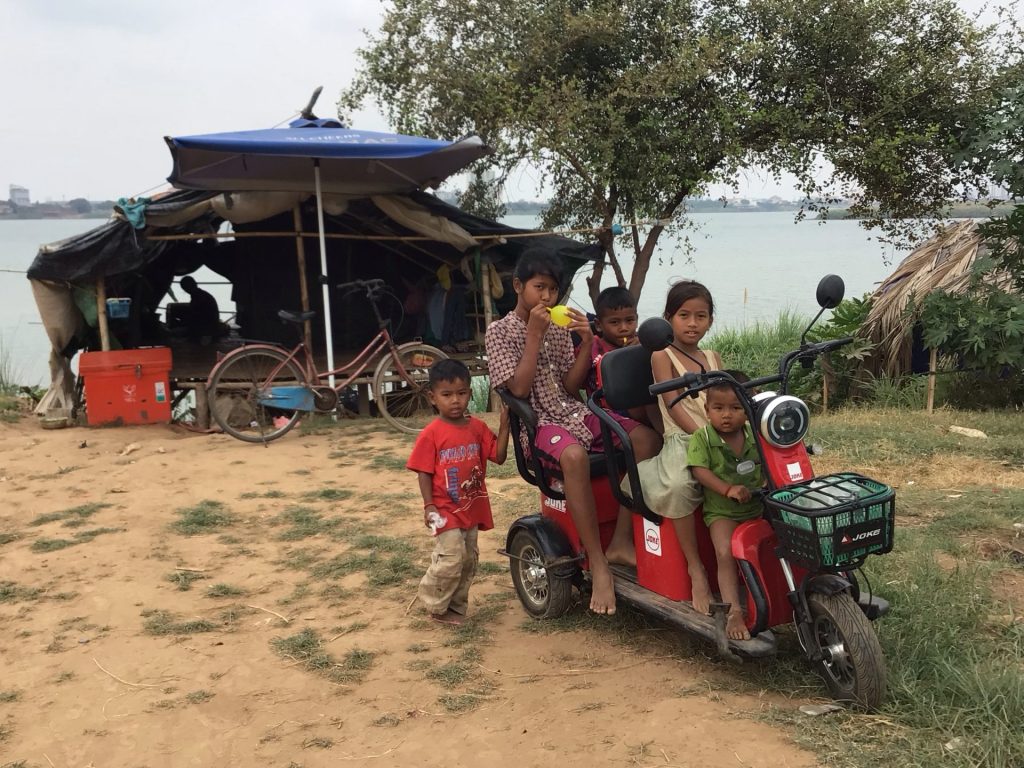 Je prends la sente à droite pour me rendre au bout de ce champ. Je tombe alors sur une cabane où les enfants jouent sur un scooter électrique. Quel sacré contraste entre ces 2 rives mais aussi entre cet engin et cette cabane où ils vivent.