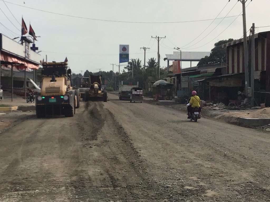 Effectivement, la première heure se déroule tranquillement. La circulation est toujours aussi fluide. De plus, j’essaie de suivre au plus près le fleuve en empruntant soit un chemin, soit un dalle bétonnée. Mais, ce n’est pas toujours possible hélas. Et, quand je reviens sur la National Road, elle est en travaux. Par contre, il n’y a aucune déviation. Des camions déversent d’abord du gravier. Plus loin, d’autres engins aplanissent.