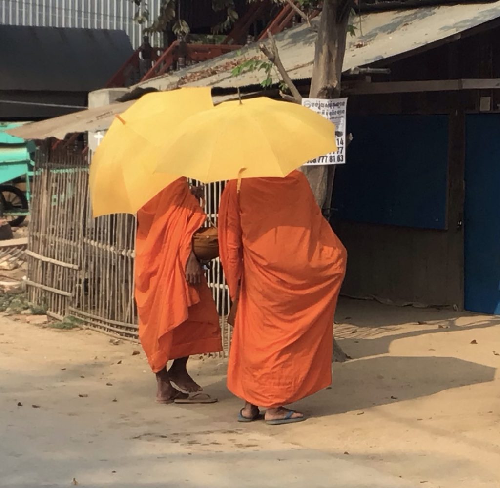 Je poursuis tranquillement ma route. Plus loin, ce sont deux moines faisant l’aumône qui attirent mon regard. Il faut dire qu’ils sont visibles de loin … même par temps de brouillard. L’aumône est constituée de quelques billets ou de riz. Ceux-ci sont chaussés de tong. Souvent, ils se déplacent pieds nus. Après avoir reçu cette aumône, ils récitent une prière pour la personne ayant donné.