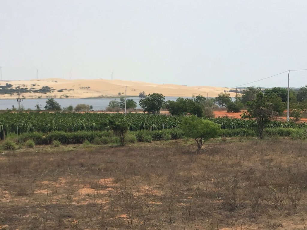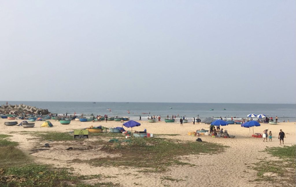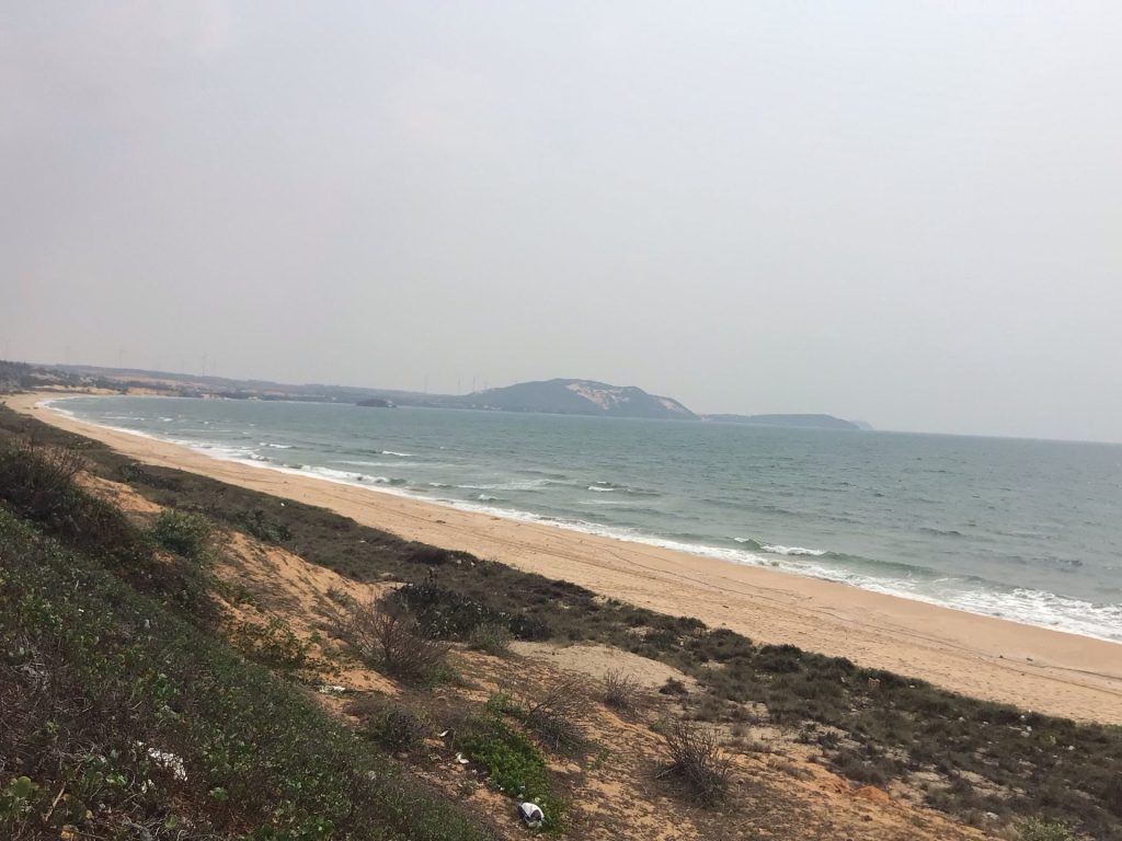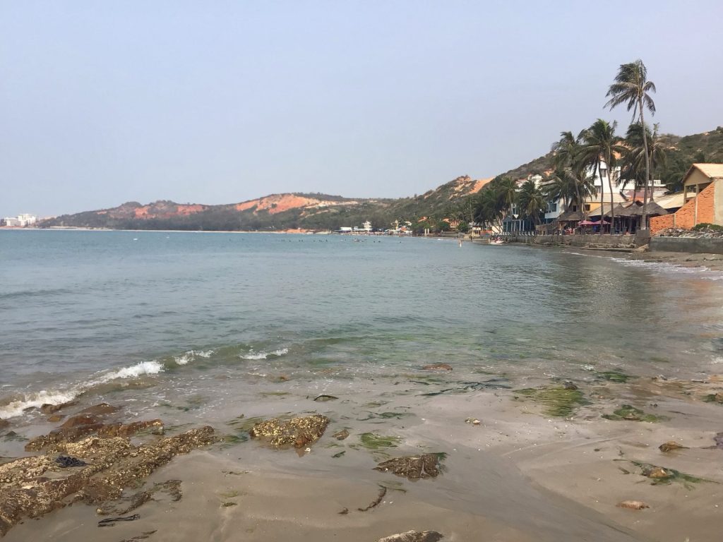 Finalement, j’arrive à mes fins après m’être arrêté dans le village de Long Son qui ferme cette petite baie. J’aperçois au loin un amas d’humains amassés sur une plage. Derrière cette baie, de grandes dunes de sable orange complètent ce charmant tableau … de loin.