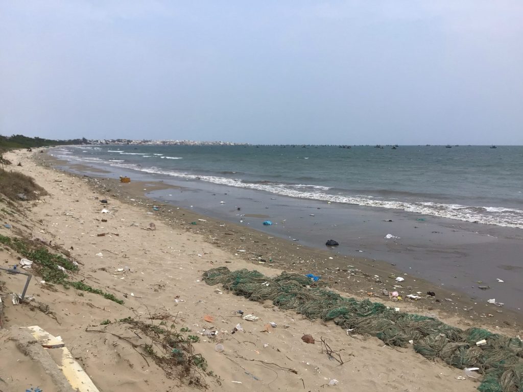 Déjà cela ne donne pas trop envie de s’arrêter. Et, de plus, je ne trouve rien même en demandant aux autochtones. Quelques-uns me font ce signe en balançant la main pour me signifier de déguerpir. Je n’ai pas d’autre choix que de continuer ma route jusqu’à Thôn Hai à 12kms. C’est reparti vent dans le pif. Je m’arrête devant un Homestay. Le prix de 500.000VND me refroidit. Je pense que ce devait le tarif de l’appart d’hier soir. Cependant, la proprio est sympa et demande à son fils de m’accompagner à scooter jusqu’à la ville pour m’indiquer des hôtels. Je décline et poursuis ma route. A 14h30, j’arrive à l’entrée de ce village de pêcheurs.