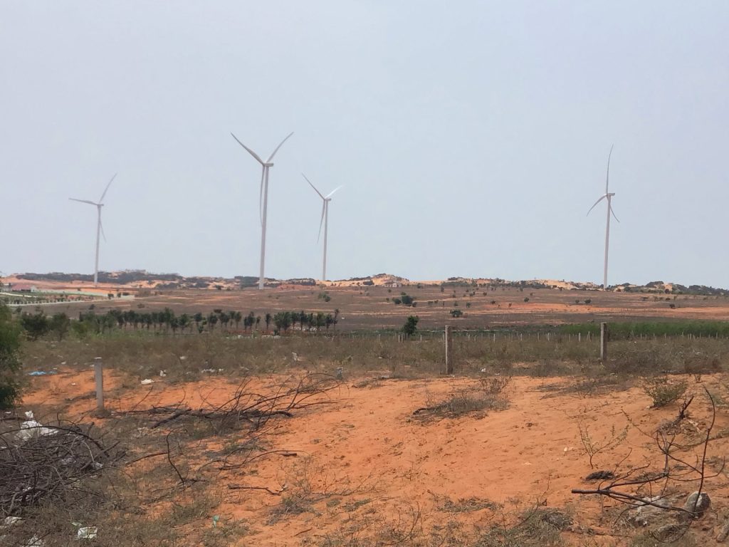 Après avoir franchi ce cap, le paysage change radicalement. Ce sont dorénavant de grandes dunes de sable orangé ou blanc parmi des étendues arides balayées par un vent violent. Des champs d’éoliennes ont été installées. Ce sont les premières que je vois depuis mon arrivée en Asie. C’est désertique. Pourtant, sur la gauche, une pelouse verdoyante se trouve devant une propriété.