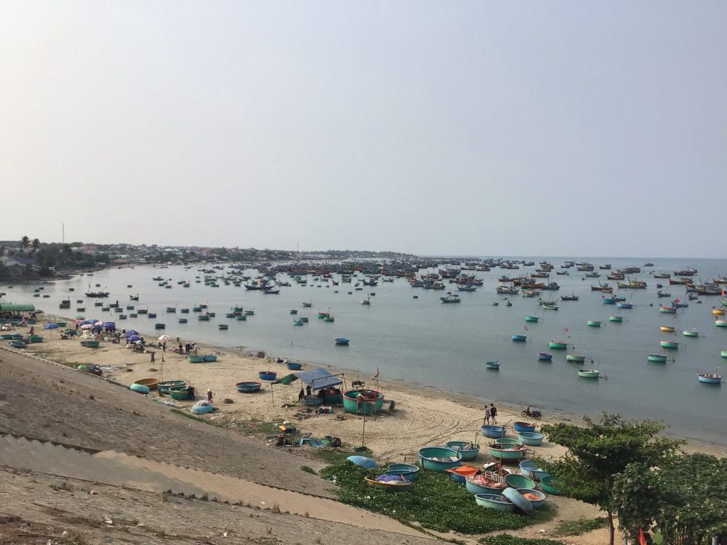 Vers 8h00, j’arrive dans la ville de Mūi Né qui ferme la baie de Phan Thiêt par un cap impressionnant. La ville est bâtie sur ce cap. De plus, ce cap forme une rade où une multitude de bâteaux sont au mouillage. Je suis aussi surpris de voir autant de touristes occidentaux à bord de 4*4. Des inscriptions en russe sur certaines vitrines attirent également mon attention. Je comprendrai pourquoi un peu plus tard.