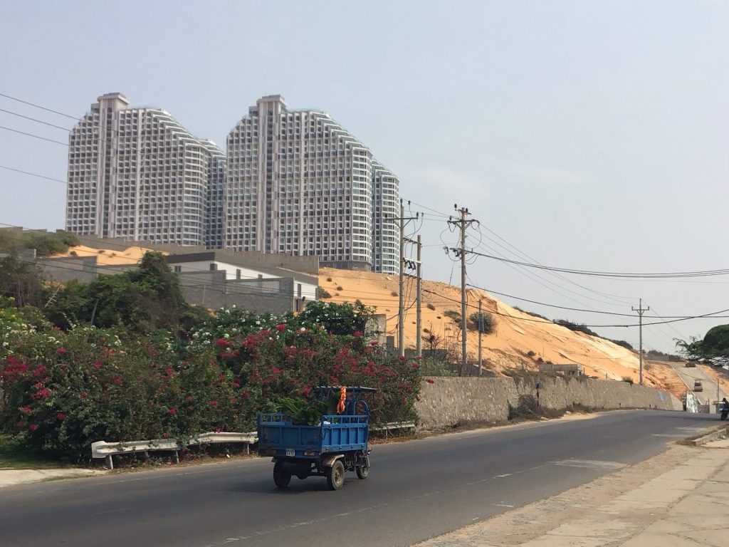 Après cette bonne baignade dans des vagues à 27°C, je repars. Il n’y a plus grand monde sur la route. Malgré ce désert et ces Resorts à l’abandon, je tombe sur deux gigantesques immeubles construits sur la dune. Ce n’est pas possible. C’est un mirage ! J’ai trop pris le soleil. Et non, l’endroit se nomme Khu Nghi Dūong Peace. Mais qui peut bien vouloir habiter ici au milieu de nulle part dans ce truc immonde ?