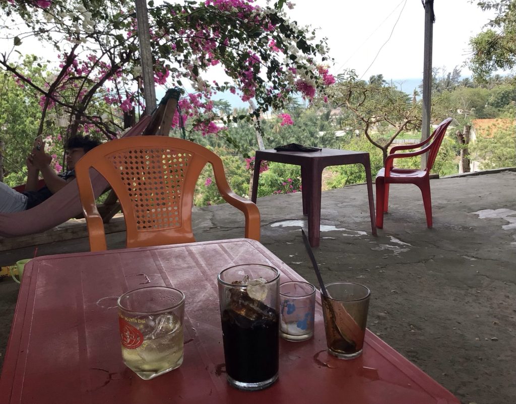 Après être parvenu au sommet de la bosse balayée par les vents, je trouve un café en bord de route. Il n’y a à nouveau pas un chat pourtant l’endroit est superbe. Je m’installe. Une mère et sa fille nettoie des poissons dans le coin de la terrasse. Le père consulte son portable. Le fils, allongé dans son hamac, joue à un jeu de guerre. Personne ne me calcule. Le fils interpelle les femmes qui interpelle le père qui demande à son fils de me servir. C’est la 1ère fois que l’on me sert un café dâ en plusieurs morceaux. Je me compose ma mixture alors que le fils retourne à ses fusillades.