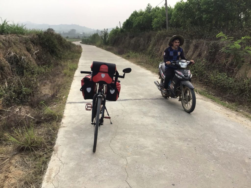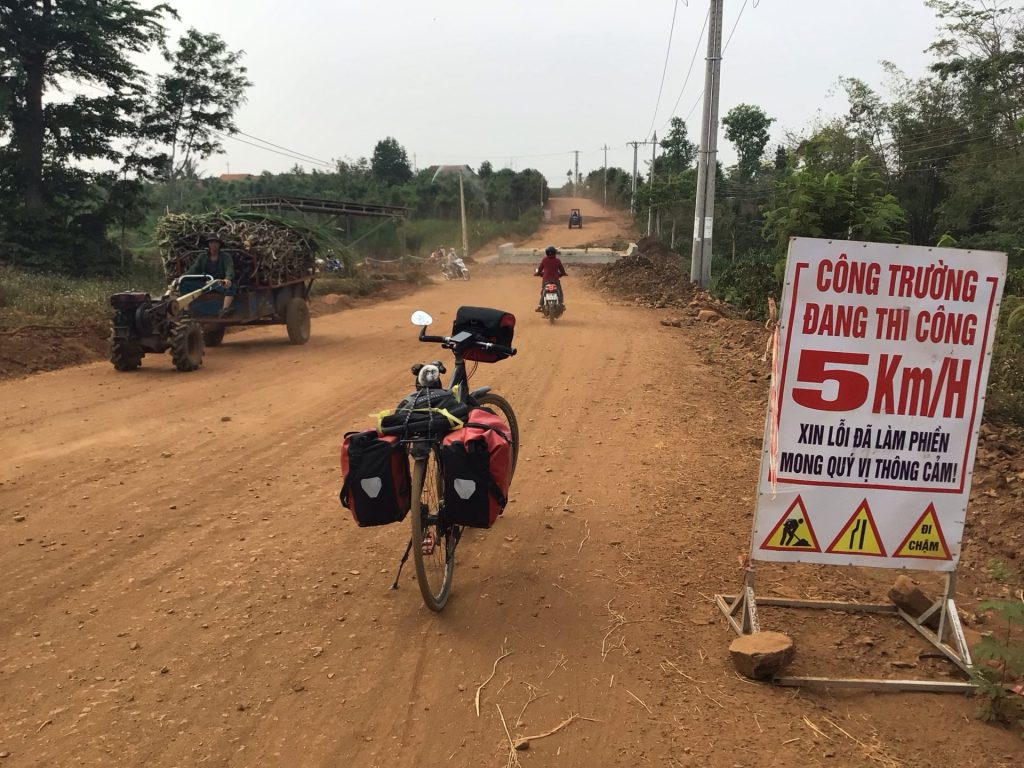 Pourtant, dans ces campagnes retirées, contrairement aux stations balnéaires et grandes villes, les vietnamiens sont beaucoup plus accueillants. Comme dans les autres pays, beaucoup me saluent d’un sympathique « Hello ! » et me gratifient d’un large sourire qui suffit à mon bonheur. Par contre, j’attaque une portion en travaux. Je retourne de nouveau dans la poussière pendant quelques kms. « Bi Châm ! »