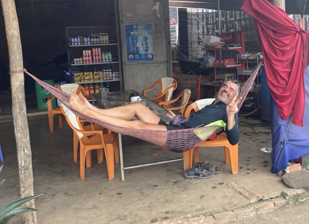 A midi, je m’arrête déjeuner dans le village de Ea Phe qui se trouve sur la route principale QL26. Comme d’habitude, j’y mange copieusement et bonnement. Et, comme d’habitude. J’en profite également pour consulter mes cartes. Le prochain hôtel repéré est à l’entrée de la ville de Buôn Ma Thuôt … à presque 40 bornes et avec du dénivelé. Cela va être chaud patate. Après ce déjeuner, je repars en direction de ce point de chute. Mais, avant cela, je m’arrête boire un nouveau café. Je vais en avoir besoin. Puis je m’allonge dans le hamac pour une trentaine de minutes de sieste. A tout à l’heure les petits …