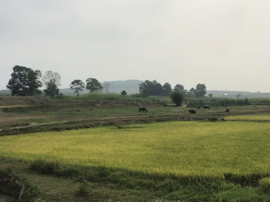 Je traverse encore et encore ces paysages de rizière avec ses buffles paissant tranquillement. Cela m’émerveille toujours autant. J’avais déjà vu ces images du Vietnam. Mais, comme m’avait dit un jour mon ami Gaugau grand baroudeur devant l’Eternel : « je suis dans le paysage ». Cette phrase m’avait marquée. Là c’est le cas, je suis dans le paysage. Je circule sans aucun bruit. Il n’y a personne. Que le paysage, les buffles et moi. Magique !