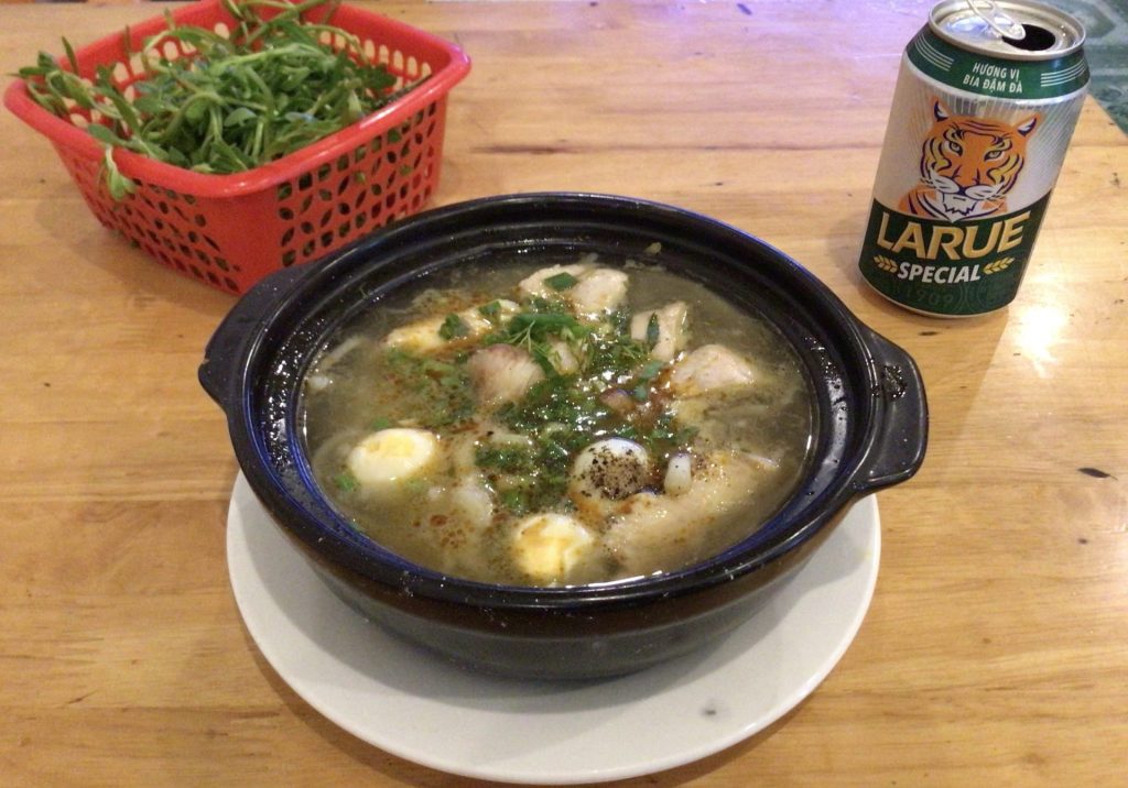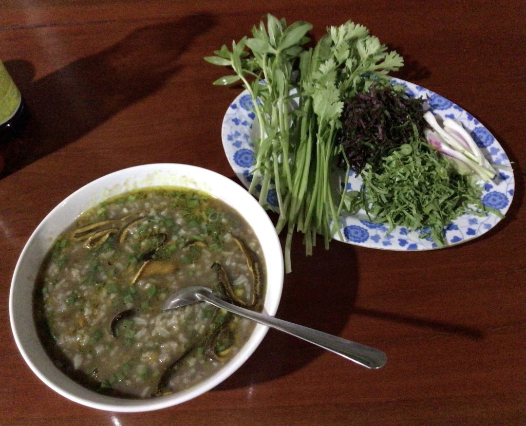 Comme cet hôtel, beaucoup de maisons récentes ont cette forme très étroite et très profonde. Les pièces à l‘intérieur sont haut de plafond. Je ne sais pas pourquoi; peut-être est-ce dû au prix du terrain ? Après ces considérations immobilières, je m’installe sur la terrasse de la gargote en face pour y déjeuner. Ce matin, ce sera soupe au riz et légumes bouillis, le tout accompagné d’un beau bouquet d’aromates frais.