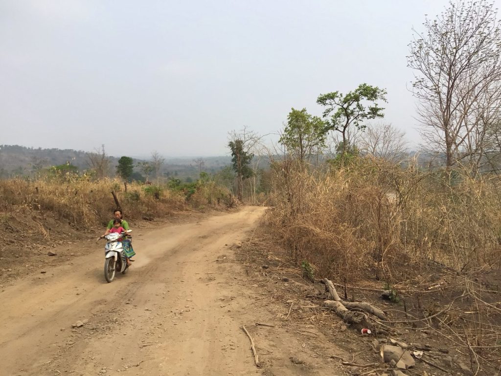 J’avais décidé de changer mon pneu arrière. Mais, vu les conditions, cette opération est à nouveau reportée. En quelques minutes, tout est inondé. Je retrouverai mes sandalettes trempées, ainsi que les autres chaussures laissées devant la porte, une trentaine de mètres plus loin sous mes fenêtres. Impressionnant ! Vers 18h00, une fois l’orage passé, je pars diner en ville à scooter prêté par le proprio. Je m’arrête à la 1ère gargote trouvée. Ce sera soupe au riz gluant, tenu au chaud dans un chaudron sous feu de bois, et abats. A la fin du repas, j’ai toute la petite famille autour de moi : le père et la mère, leur fils barber dont le salon est sis à coté, la jeune et charmante belle-fille et leur fils âgé de 7 ans. Je branche le traducteur pour pouvoir échanger plus facilement. Chacun me pose ses questions ce qui amuse beaucoup la mère. En début de soirée, je rentre dans ma chambre. Demain, je continuerai ma remontée ver le nord en longeant la frontière cambodgienne.