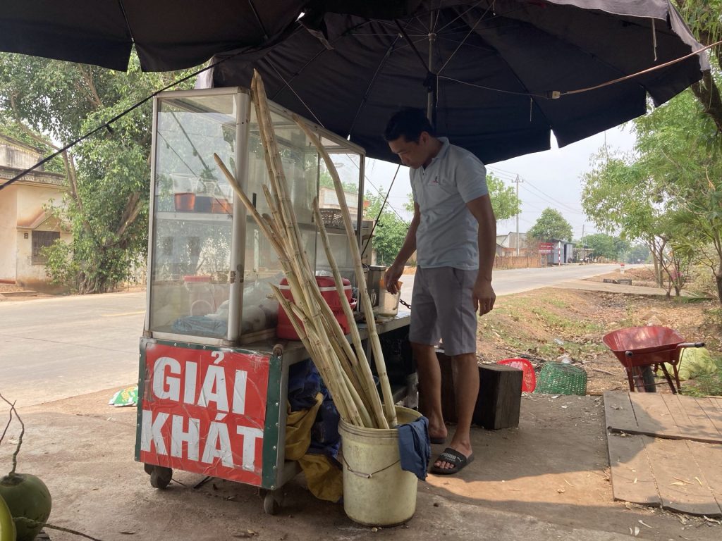 Après cette partie de cyclo-cross, j’arrive dans la bourgade. Il est bientôt 11h. Je suis couvert de poussière et j’ai soif. Je m’arrête dans une gargote pour y boire un jus de canne à sucre bien frais. Un délice ! Et là, c’est vraiment du producteur au consommateur.