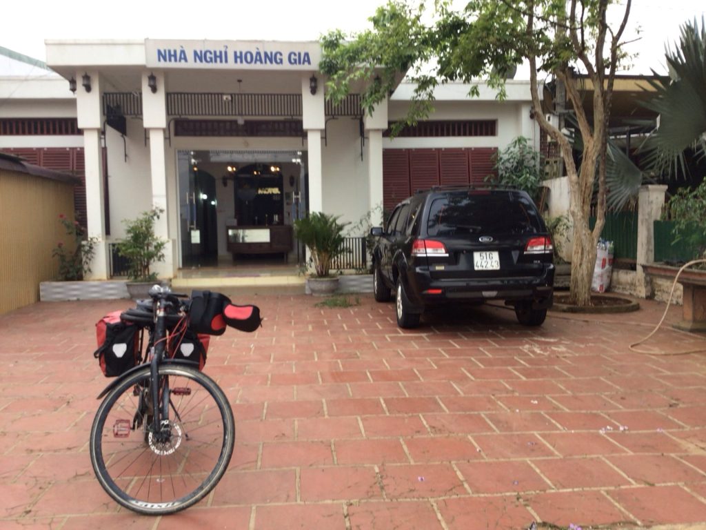 Je décide d’aller boire un café pas très loin dans un cadre anglicisé avec de belles phrases sur le développement personnel. Pourtant, le jeune patron ne le parle pas. Mais il m’indique quand même un point dans ce village. Après avoir demandé confirmation à un magasin de téléphonie, j’arrive bien devant un « Nhà Nghi » après avoir emprunté un chemin de terre. La chambre est au même tarif que d’habitude. Je ne demande même pas à la voir. Je me pose. Pour le même prix qu’hier, c’est du rural ! Il y a un lit, un tuyau de douche (la pomme a été mangée), une clim’ réglée sur 20°C (brrr), une fenêtre sans vitre mais avec des volets fermés par un fil de fer. Et j’ai vu sur le champ d’à côté. Ce sera parfait pour cette nuit. Sinon il me fallait rejoindre la route principale QL14C, longeant la frontière cambodgienne, à 24kms d’ici sans être certain du tout de trouver un hébergement. Je m’installe. Il est un peu plus de 14h. Fin de cette nouvelle étape de 85 bornes accidentées.