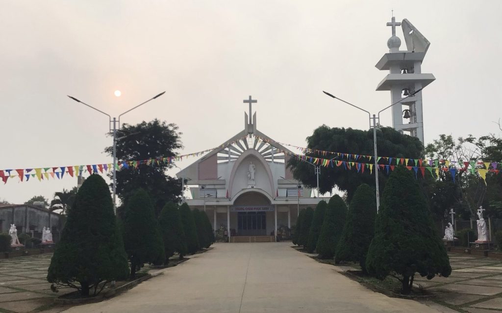 Je traverse ensuite le village sur un long faux plat montant en suivant la route principale QL26. En haut de cet échauffement matinal, je bifurque à gauche pour rejoindre mes chemins de traverse dans la cambrousse. Auparavant, je marque un premier arrêt pour photographier l’église de ce village alors que le soleil perce à travers les nuages. Sur les 2 côtés de cette église, des statues blanches représentent un chemin de croix.