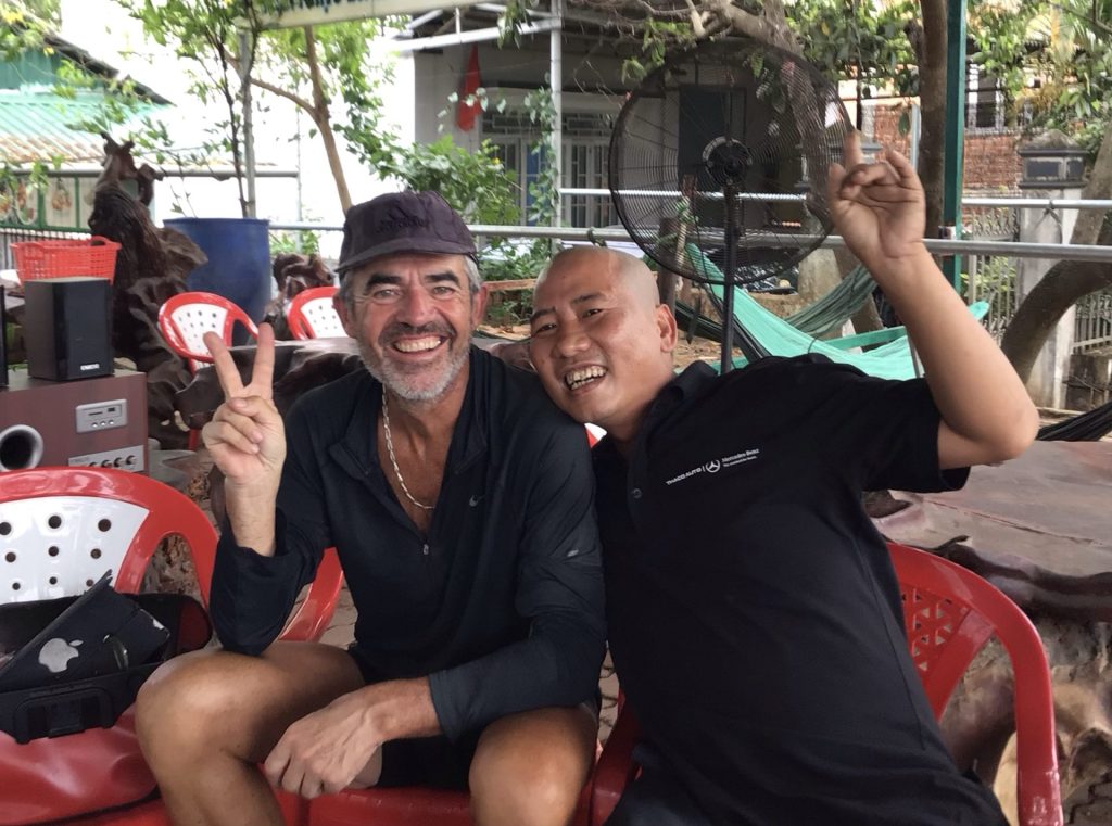 Encore un dernier effort. Il est 13h00. Je m’arrête devant le premier restau venu. Un truck énorme à l’américaine, avec une grande remorque, est garée devant. Je salue la compagnie et m’installe su une table non occupée. Le gars au polo noir, Dong, m’invite à se joindre à sa table. J’accepte bien volontiers. Ils sont quatre à festoyer. Dong est cambodgien mais vit au Vietnam. C’est lui le chauffeur du poids-lourd. Je sors mon traducteur et je réponds à ses nombreuses questions. Il me propose de piocher dans leurs plats : poisson, sanglier, riz ! Et bière à volonté … D’ailleurs, deux de ses acolytes sont bien éméchés. Un ne me calcule pas trop. Une bonne heure plus tard, je m’apprête à partir. Je suis naze. J’ai un peu trop picolé. Et j’ai envie de me poser.