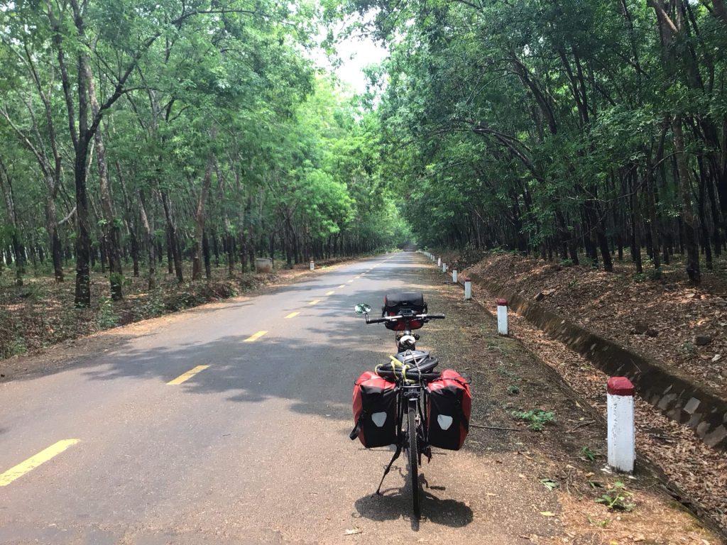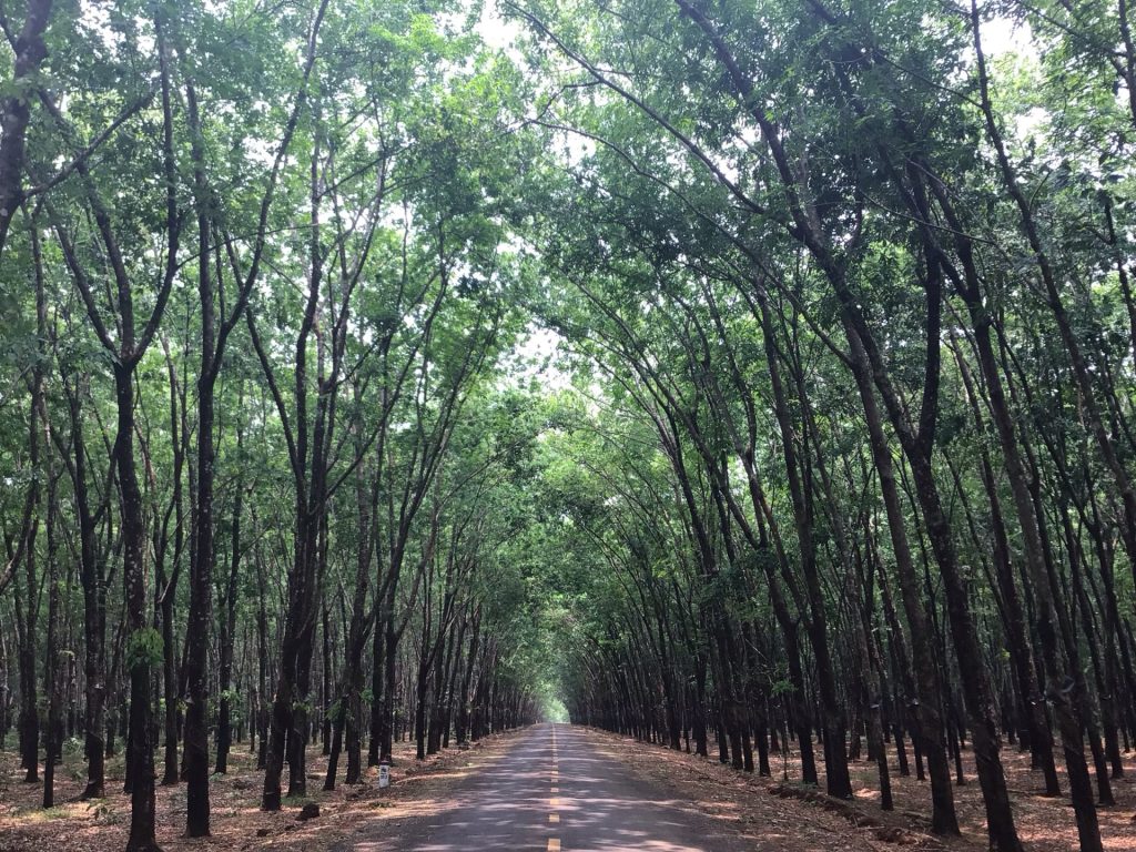 Je traverse dorénavant une magnifique forêt d’hévéas dont les frondaisons forment une voute bienfaitrice. Il est bientôt midi et le soleil bastonne fort.