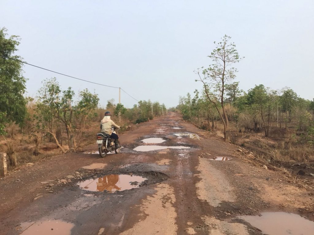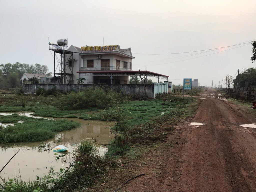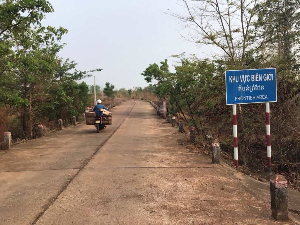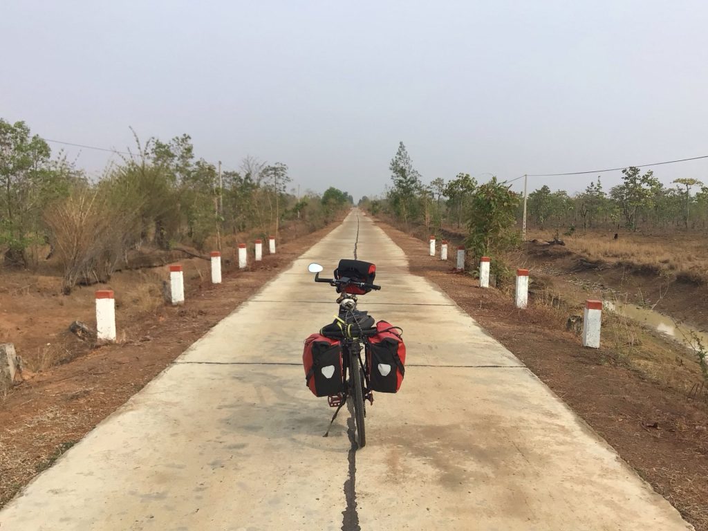Enfin façon de parler. Je suis plutôt bien ancré sur ma route bétonnée qui traverse toujours ces immensités désertiques. 9h00 sonne quand je passe la borne indiquant qu’il me reste 50 bornes jusqu’à l’intersection avec la route nationale QL19. Actuellement, je circule sur la QL14C parallèle à la frontière vietnamo-cambodgienne.