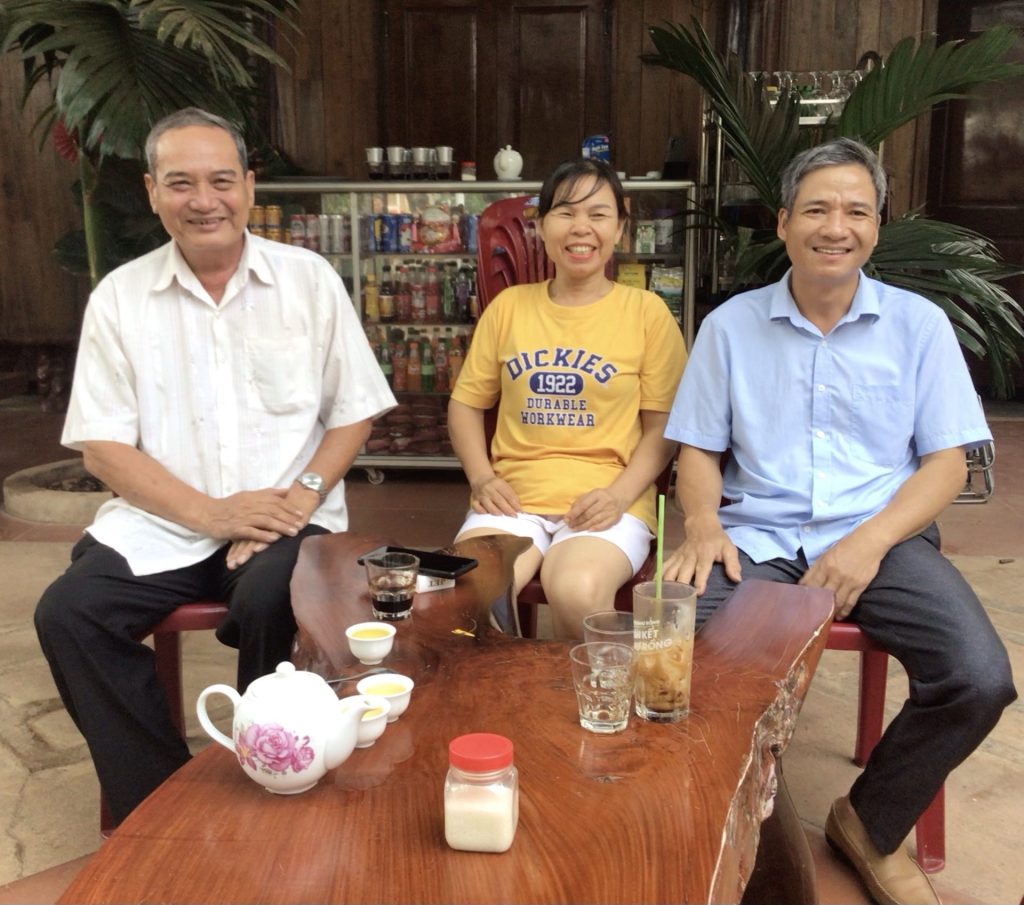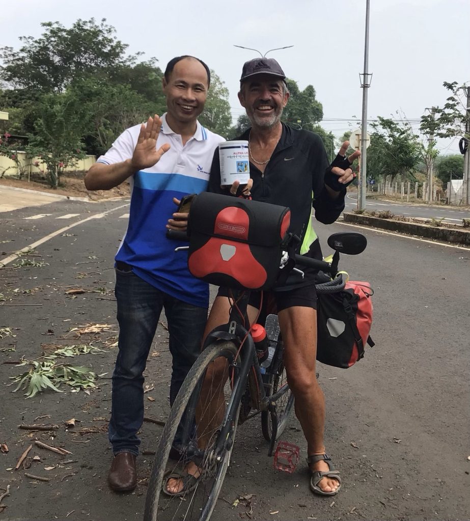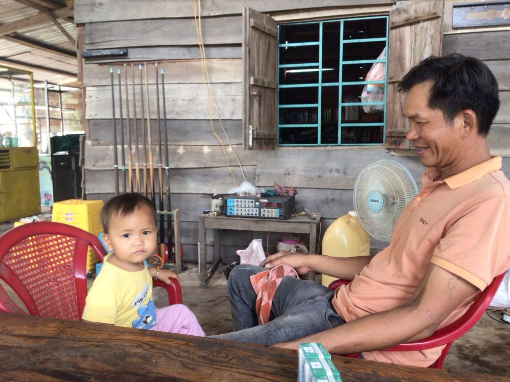 Vers 9h30, je traverse le hameau de Chu Prong en bord de route. Je cherche un café pour ma pause syndicale. Je demande à des jeunes attroupés dans un atelier scooter. Ils m’indiquent qu’il faut prendre une piste pour trouver un café ouvert. Je m’y dirige. A nouveau, l’accueil est chaleureux. Je m’installe à l’unique grande table en face du patron avec sa fille dont il a l’air très fier, comme tous les papas avec leur fille. J’engloutis aussi une brioche à la noix de coco en buvant mon second café da de la journée.