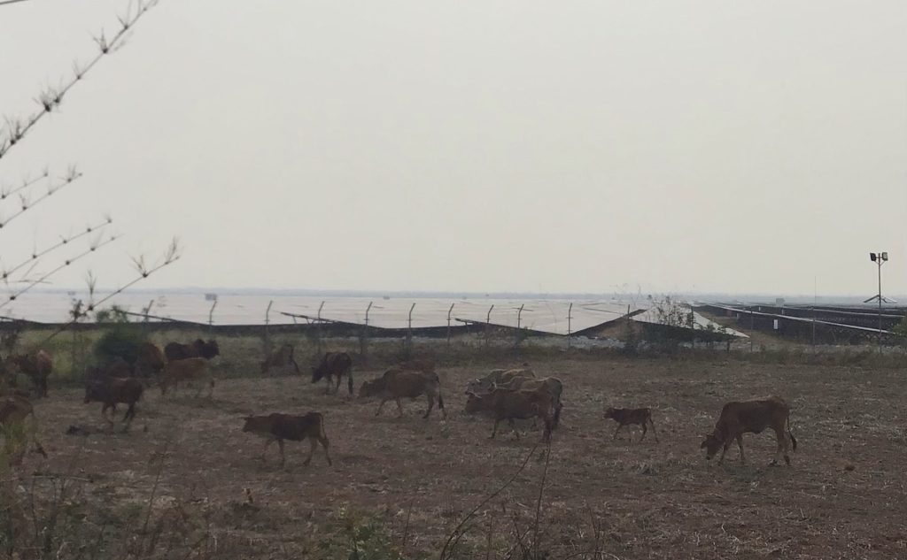En le contournant, je me rends mieux compte du gigantisme de ce parc. Il est clos de barbelés. Des éclairages, fonctionnant au solaire évidemment, l’éclairent la nuit. De plus des miradors sont disposés à chaque angle. Impressionnant. Un troupeau de vaches longe ce parc sans moufter.
