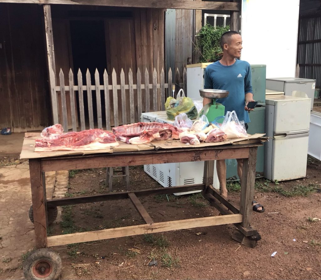 Avant d’enfourcher Haka2, je ne peux m’empêcher d’aller voir le stand du boucher juste en face. Des chiens trainassent devant son étal. Je lui demande par geste si les chiens ne viendraient pas voler sa viande. Il me répond que non.