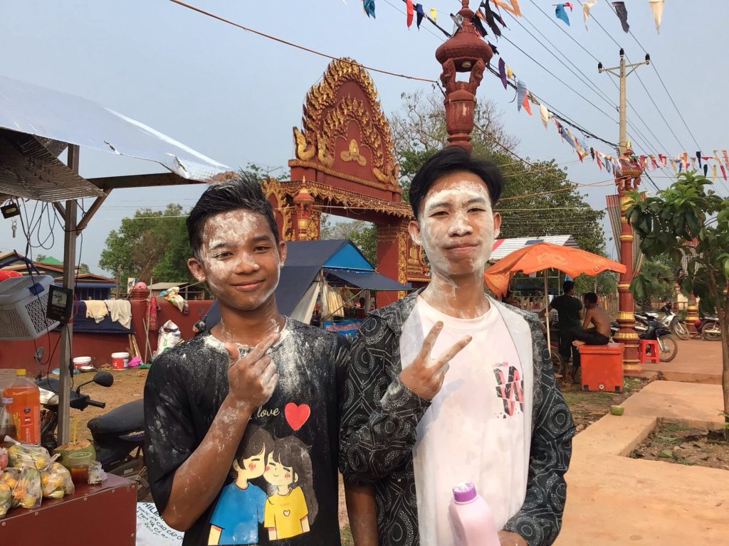 Peu avant 16h00, j’arrive enfin à destination. J’aurais parcouru ces 37 kms en à peine 2 heures pauses comprises. Au retour, je vais voler sur mon Rocco carbone. Je m’arrête devant le temple bouddhiste pour y boire une boisson fraiche. C’est également la fête ici. En discutant avec ces 2 jeunes, j’apprends qu’ils fêtent la nouvelle année comme au Laos.