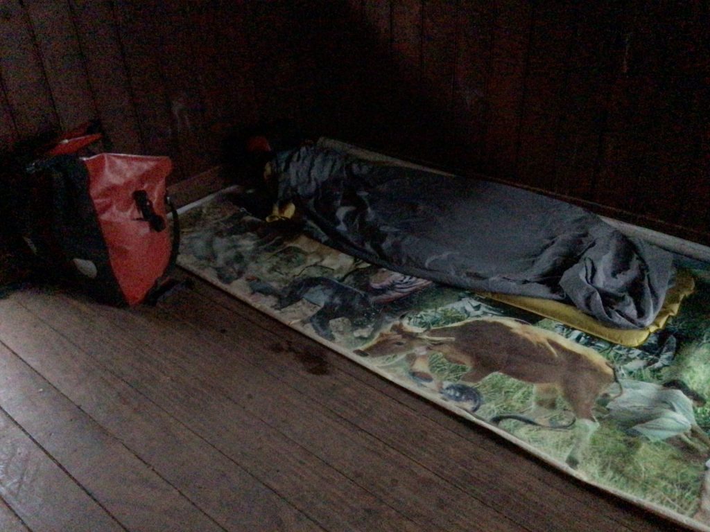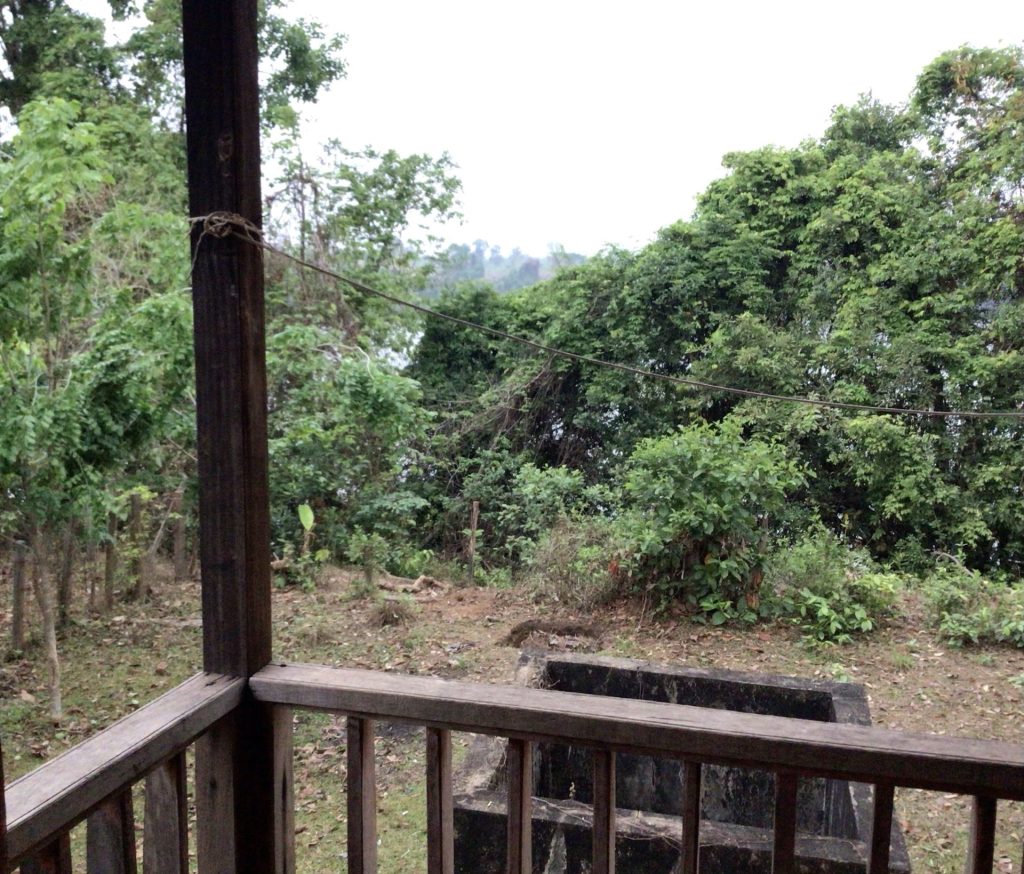 En écrivant ces lignes, j’ai un doute concernant le traversier. Il ne me semble pas en avoir aperçu un. Et, demain, je dois franchir cette rivière pour monter au Laos. Demain, il fera jour. Donc, j’ai maintenant le choix de dormir au temple avec la musique une bonne partie de la soirée ou de trouver un squat. Je me balade des 2 côtés du chemin qui longe cette rivière. En remontant la rivière, j’arrive à la sortie du village. Juste sur ma gauche, se dresse une bâtisse en bois. C’est la Maison des Rangers du Parc National de Veun Sai qui se trouve au-dessus de la rivière. Je vais aller voir s’ils peuvent m’héberger. Je rentre. La maison est vide. Je visite et trouve une pièce, certainement une chambre mais sans mobilier, qui donne côté rivière. Ce sera parfait pour cette nuit.