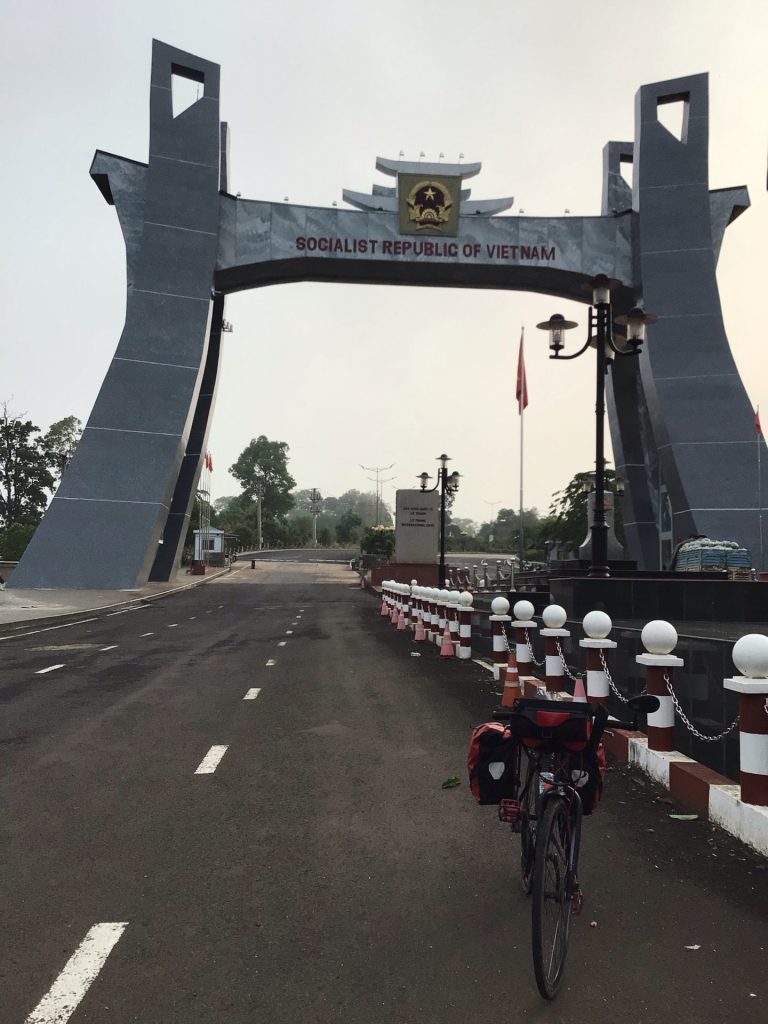 Je sors du Vietnam en passant sous cette immense arche à la gloire de République Socialiste du Vietnam. Le contraste avec le poste frontière cambodgien est saisissant. J’arrive et me présente au guichet des admissions. Mais il n’y a personne. Un gars en terrasse est obligé d’aller réveillé le garde frontalier. Puis, il remplit ma fiche à la main ce qui prend un temps certain, pour ne pas dire un certain temps. Ensuite il me faut aller tamponner mon visa au bureau d’à côté. Mais le fonctionnaire est occupé avec les sorties du territoire pour les cambodgiens qui partent bosser au Vietnam. Finalement, après une bonne vingtaine de minutes, je peux entrer à nouveau au Cambodge.