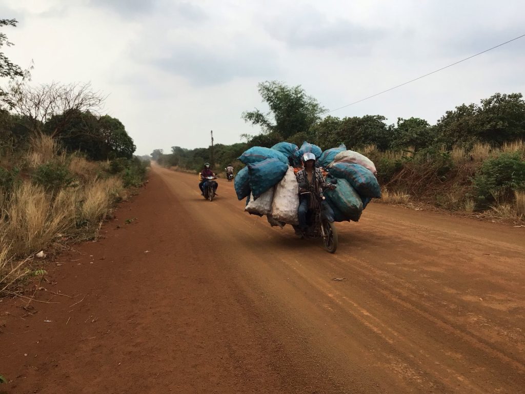 Je poursuis mon chemin dans la poussière soulevée dès qu’une voiture ou un camion passe. Heureusement, ce n’est pas la majorité des véhicules circulant sur cette piste. Le paysage devient à nouveau sauvage après avoir traversé des plantations d’anacardiers.