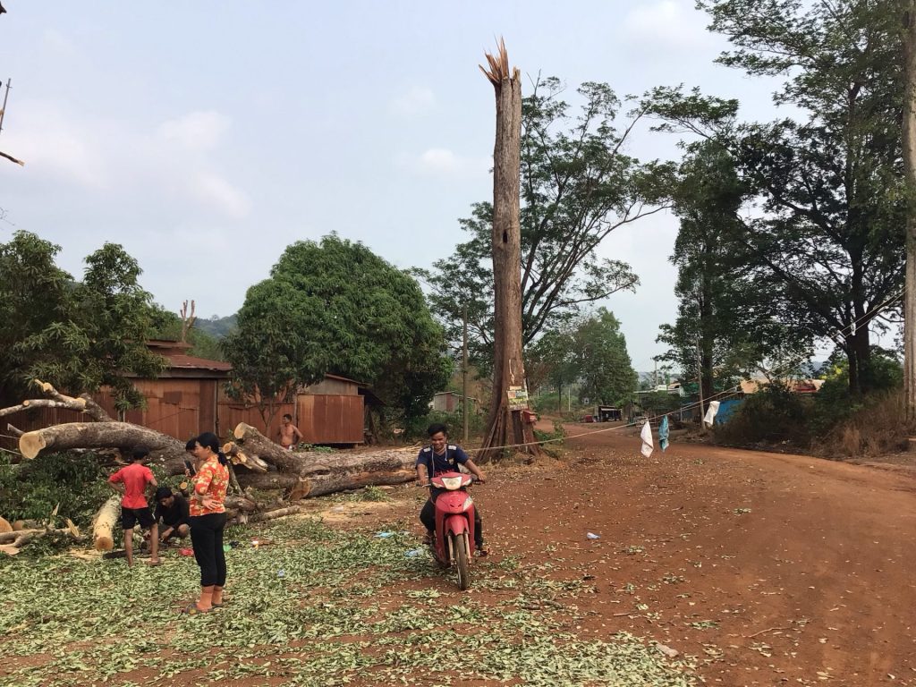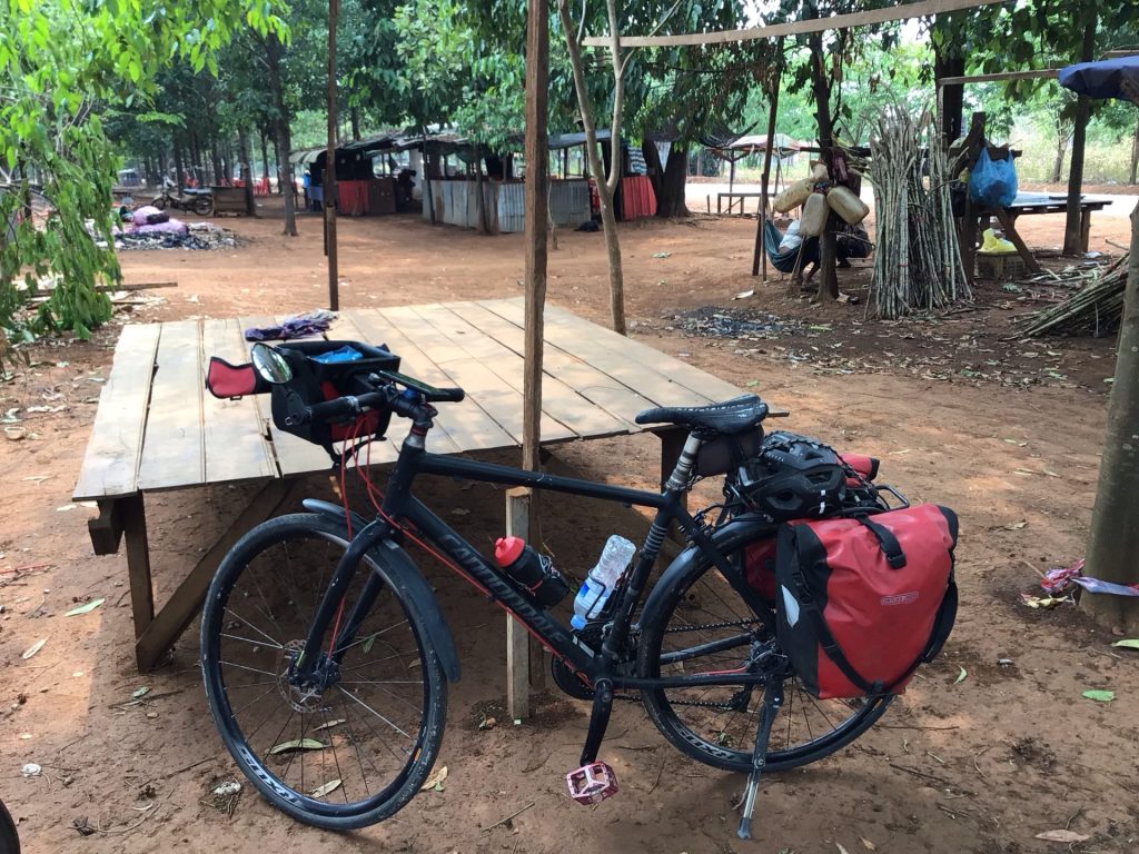 J’arrive à Banlung peu avant 13h00. Je m’y arrête pour déjeuner. Ce midi, ce sera riz et poule au pot. Une fois, la peau du ventre bien tendu (merci petit Jésus), je prends la direction de Veun Sai au nord-ouest. Mais avant d’attaquer ce long tronçon, j’ai besoin de récupérer un peu. En sortant de la ville, je repère une plateforme alors que de nombreux marchands ambulants dorment déjà dans leur hamac. Je m’y installe pour 30 minutes de repos amplement mérité.