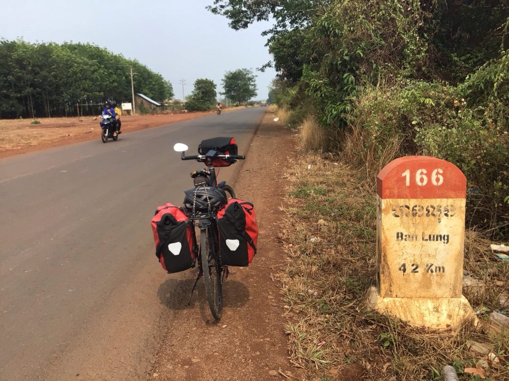 Je prends la route de la frontière mais bifurque à droite pour récupérer la route nationale QL14C. Au départ, après une grosse descente, j’emprunte une route bétonnée. Mais, très rapidement, cette route se transforme en une méchante piste boueuse. Je vérifie ma carte. Je suis bien sur la bonne route. Je continue sur un kilomètre espérant retrouver une route carrossable. Rien. Je suis dans la pampa. Personne. Je n’envisage pas de poursuivre sur cette piste pendant 150 bornes. Finalement, je décide de rebrousser chemin et de suivre l’option 3 comme initialement prévu. Le poste frontière n’ouvrant qu’à 7h, je m’arrête déjeuner à Duc Co. Cela commence bizarrement ce matin.
