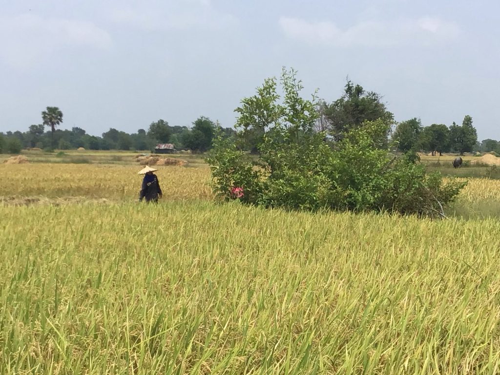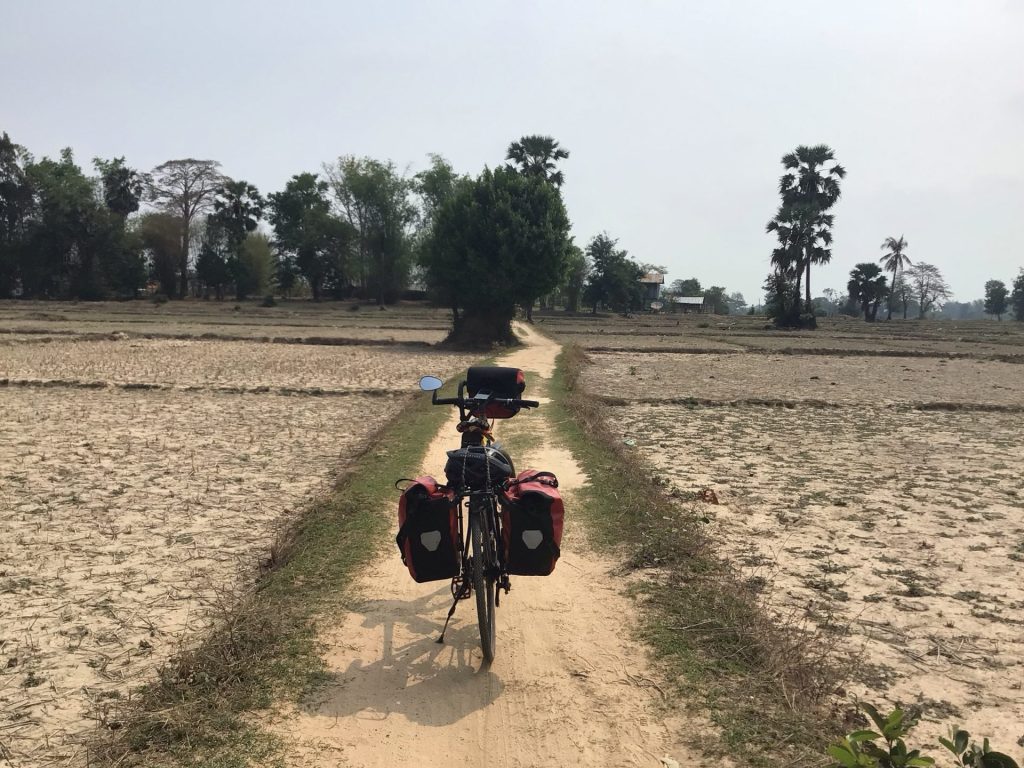Quelques minutes plus tard, je débarque sur Don Som, une île toute en longueur. Là, il n’y plus aucun touriste. Donc plus aucune piste bétonnée. Je suis un chemin de terre parallèle au fleuve côté est. je traverse des rizières asséchées. Le contraste est saisissant avec les 2 autres îles.