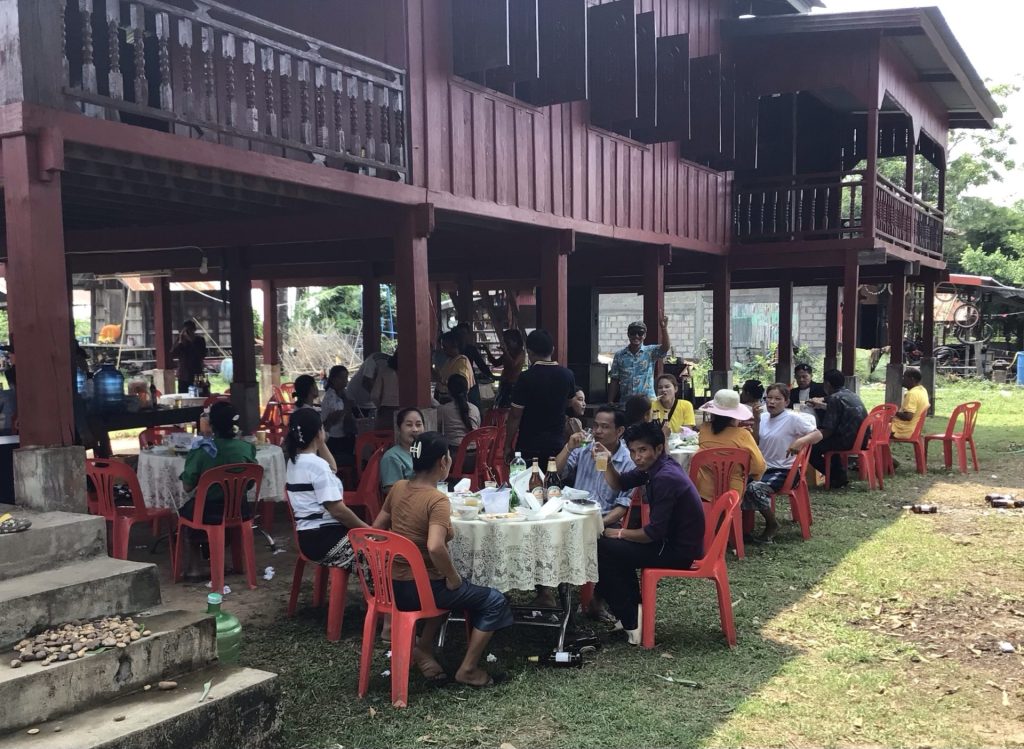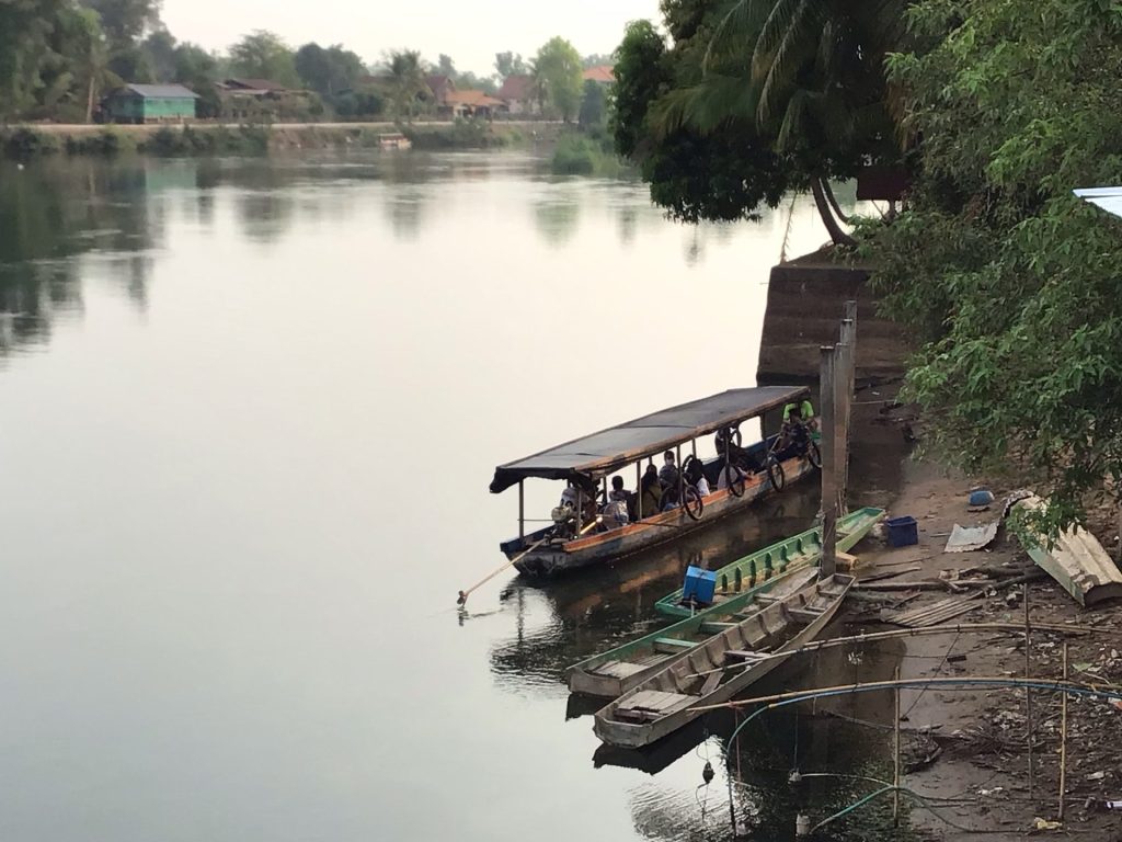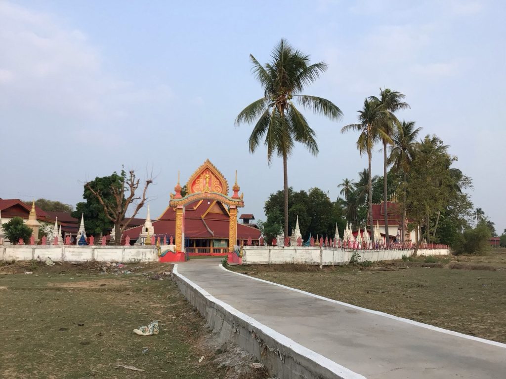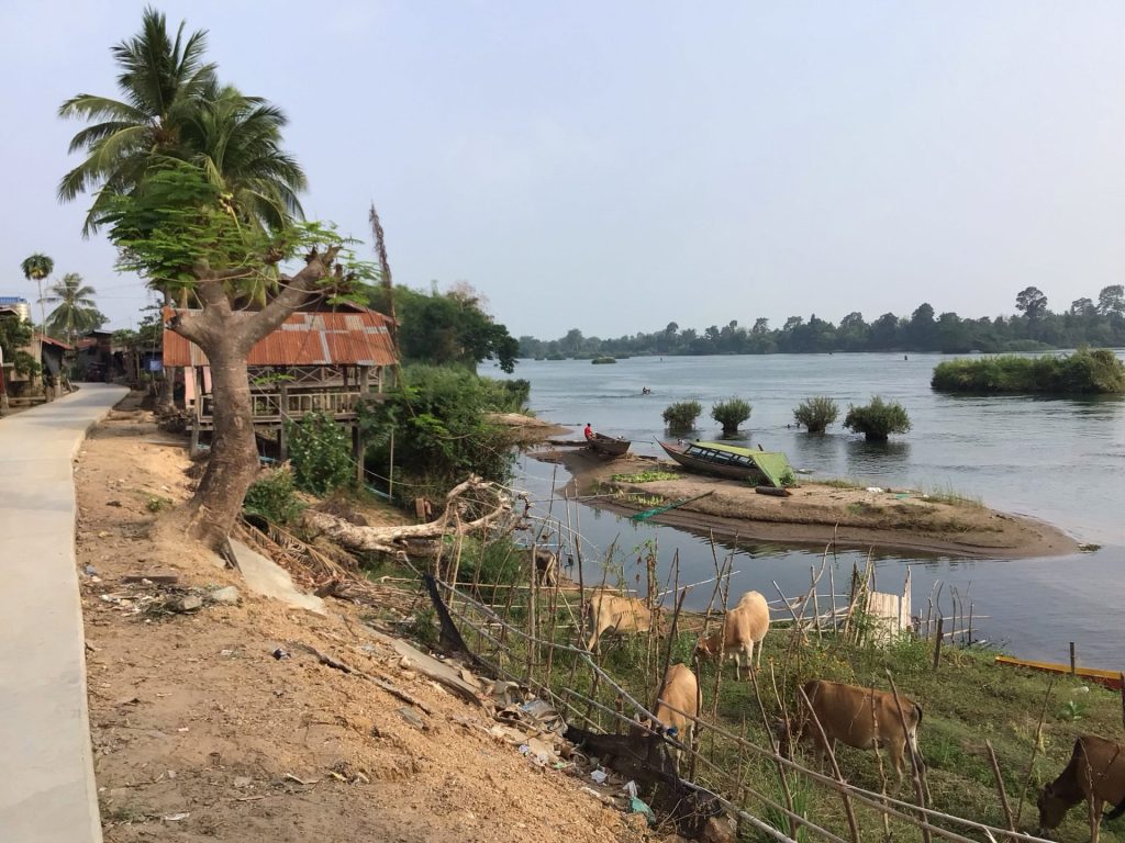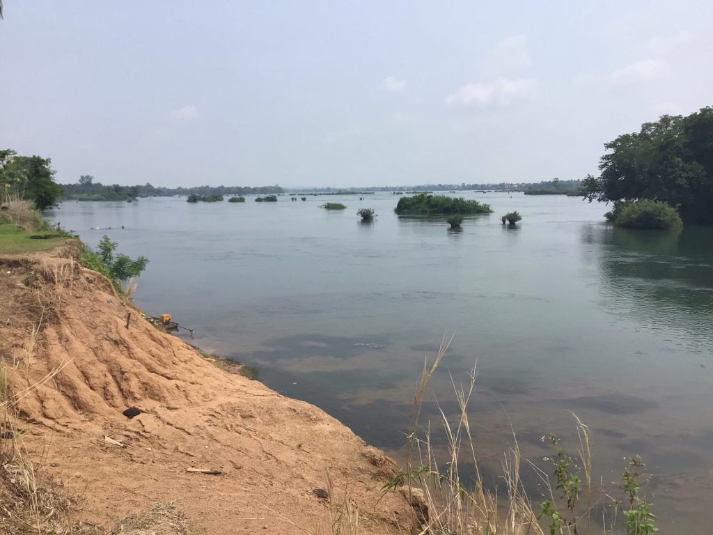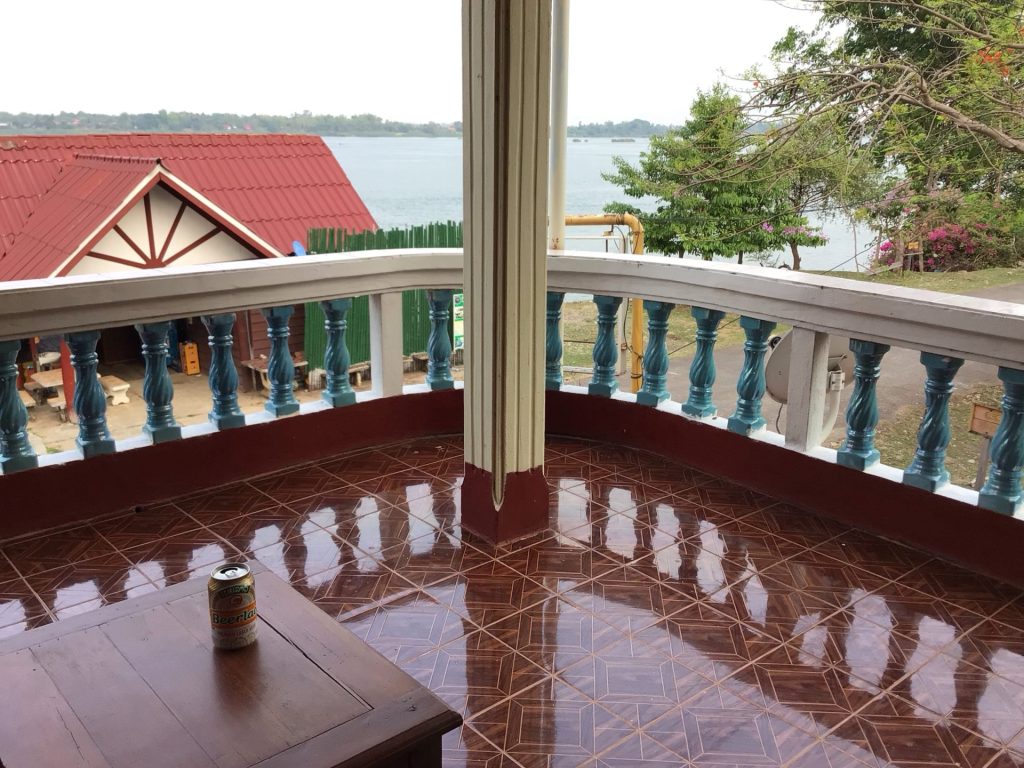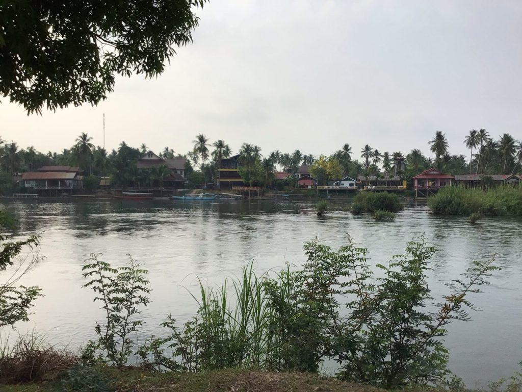 En fin de matinée, j’aborde sur la dernière et la plus grande île de Don Khong. Celle-ci est reliée au continent par un pont. Je préfère continuer mes pérégrinations insulaires. C’est trop agréable. Cependant, sur celle-ci, une route bitumée la parcourt. Je prends alors un chemin en latérite le long du fleuve. Je m’arrête déjeuner dans le village principal de Muang Khong. Au menu unique, ce sera noodle soup. Bien qu’à l’écart du fleuve et des restaurants avec terrasse qui n’attirent pourtant pas grand monde, celui-ci est blindé. Je pars ensuite à la recherche d’un hébergement. La chaleur est accablante. J’ai envie de me poser et de profiter encore et encore de ce calme avant de retrouver le continent et les routes à bagnole. Je déniche un GuestHouse charmant en bordure de fleuve. La nuitée est à 150.000LAK (8€) avec air cond. Parfait.