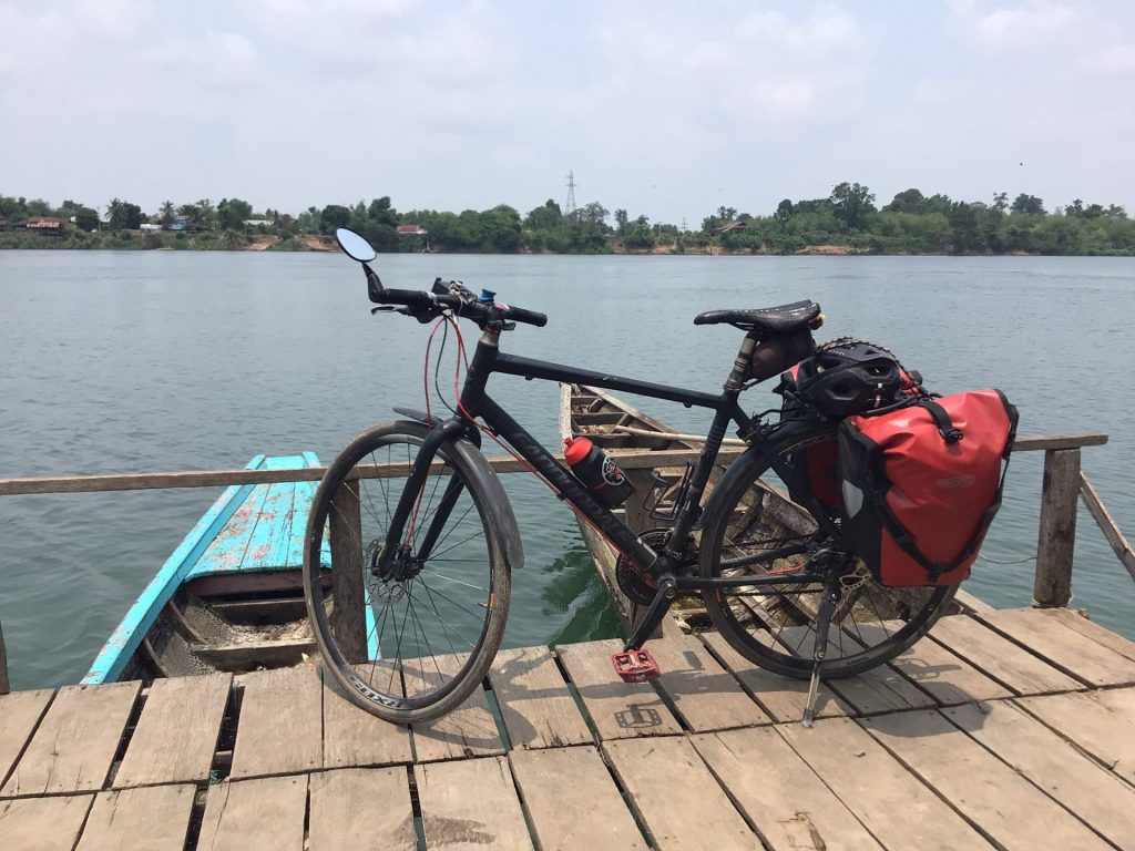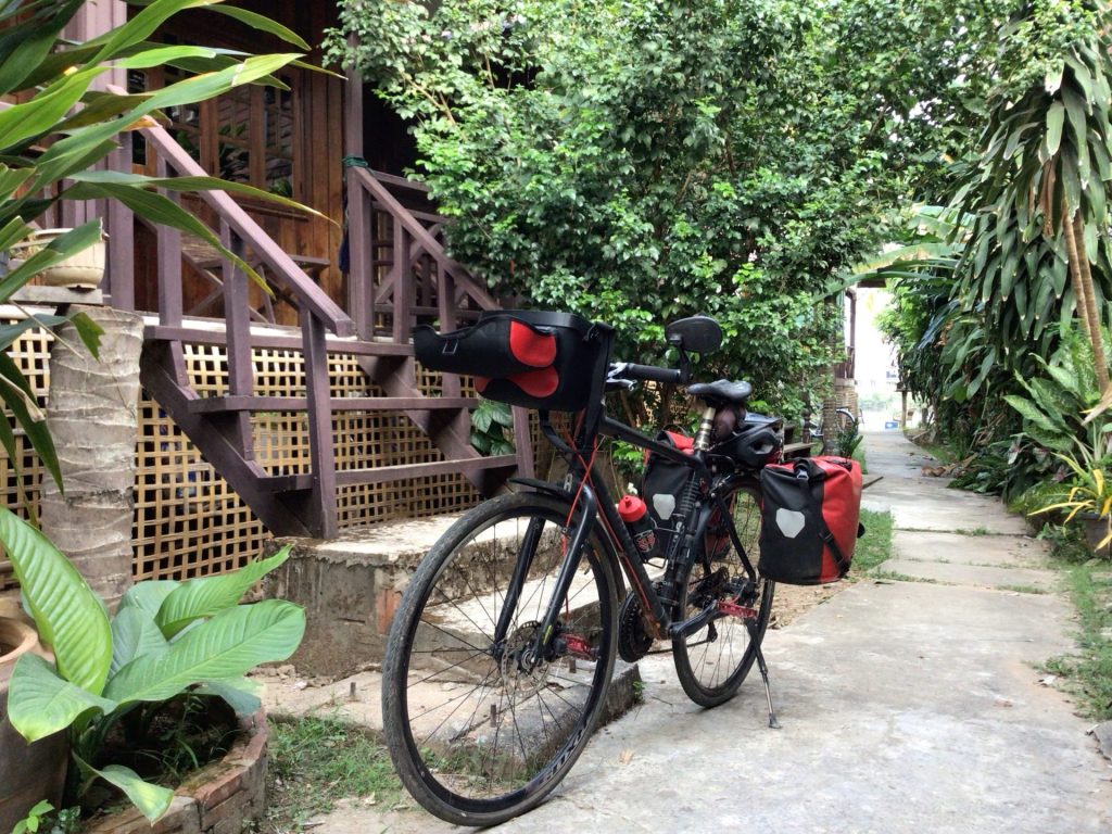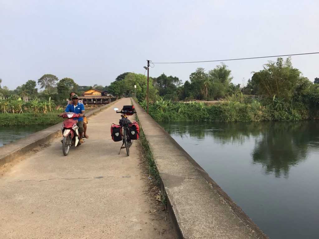 La vue sur le fleuve est toujours aussi belle avec toutes ces petites « îles » qui le parsèment. Sur ces chemins de traverse, je croise de nombreux enfants également en vacances comme au Cambodge. Les « Hello ! » ont fait place à « Sabadi ! » le bonjour local et, de temps en temps, à des checks à mon passage. Je me régale à nouveau à rouler dans ces superbes paysages. Tout est calme. Pas un bruit. Les gens sont paisibles. Beaucoup regarde le temps qui passe allongé dans un hamac. Que cela fait du bien …