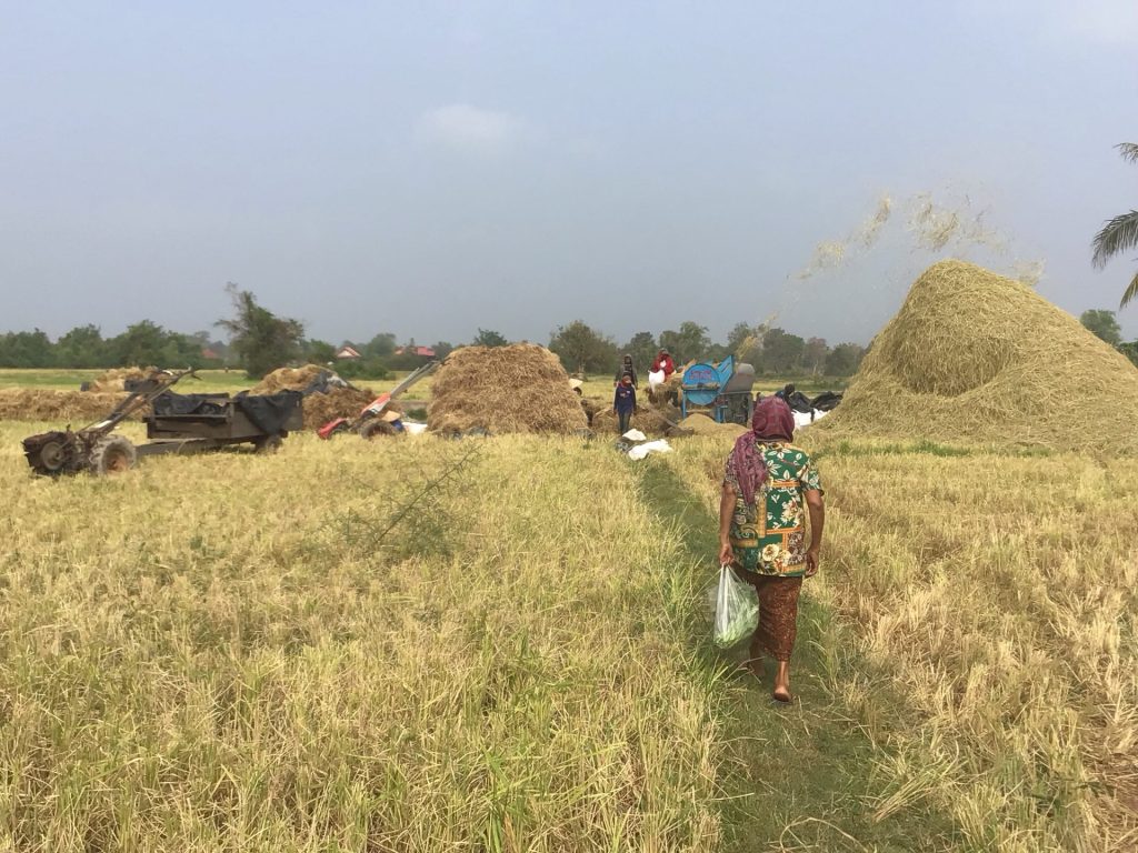 Quelques rizières sont encore irriguées et peuvent donner une deuxième récolte. Après la récolte, les brins portant le riz sont hachés et nourrissent les herbivores. La vieille dame apporte de quoi se restaurer aux hommes en plein boulot et en plein cagnard.
