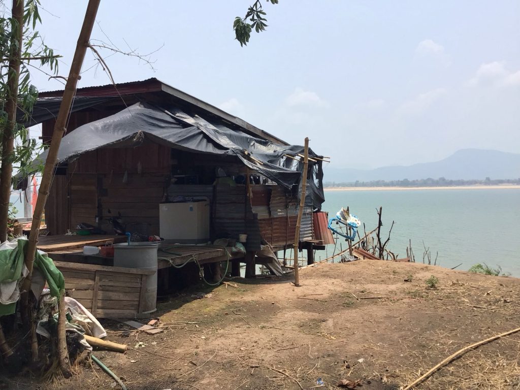 Je repars et me dépêche vu que le temps est en train de tourner à l’orage. Le premier GuestHouse visité est trop cher. Le second, tenu par un jeune couple de lyonnais qui a repris l’affaire depuis 2 mois, est le bon. J’ai juste le temps de poser le vélo que l’orage éclate. Cette fois-ci, j’ai carrément la terrasse au bord du fleuve. Le vent souffle si fort qu’il soulève des vagues sur le Mékong. C’est impressionnant. Je m’installe sur la table pour rédiger ces lignes. Mais, après une accalmie, la pluie redouble d’intensité. Le toit fuit. Je rentre au sec.