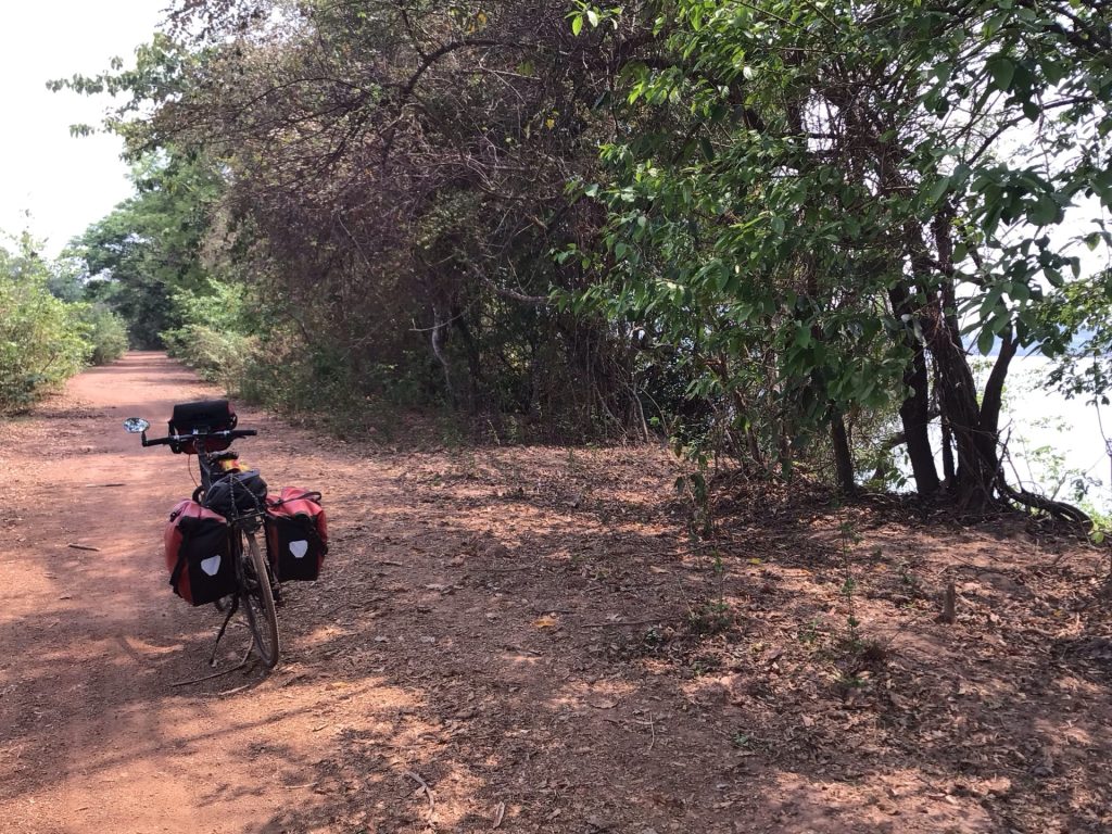Cela fait un bien fou. En remontant sur la berge, je retire mon tee-shirt à manche longue, que je porte depuis 3 mois, afin de l’essorer. J’entends un craquement. Je l’ai ouvert dans le dos. De toute façon, à force de le porter et de le laver quotidiennement, il était au bout du bout. Cependant, il va falloir que je trouve une solution pour me protéger les bras, mon autre tee-shirt étant à manche courte. J’irais faire des emplettes demain. Ceci est un petit problème. Le plus important est de régler celui de mon dérailleur arrière. Le pilote du traversier arrive dans ces entrefaits. Il n’y a que moi de ce côté. J’embarque et on traverse. Je retrouve un chemin longeant le fleuve. Au loin, je remarque une longue bande de sable blanc. Je m’arrête devant un Resort 5* qui a squatté la rive (humour noir comme les bâches de cette cabane).