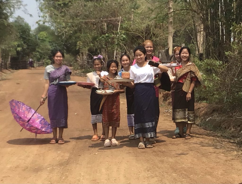 J’avance cahin-caha. Dans le village de Moonlapamok, j’ai la surprise de voir arriver devant moi de charmantes laotiennes en tenue traditionnelle apportant des présents à un mariage. Je pile, sors mon iPad en mode appareil photo, me positionne et leur demande l’autorisation de les photographier. C’est avec de grands sourires et des « Sabadi ! » qu’elles me répondent en chœur.