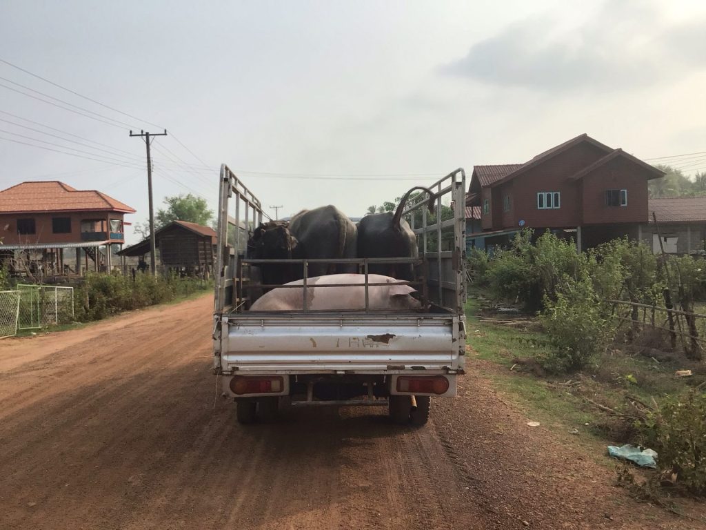 Après cet intermède culturel, je retrouve une piste en latérite parallèle au Mékong. Pourvu que ça dure … Comme toujours, le spectacle est partout. Cette fois-ci, c’est dans cette bétaillère où un pauvre cochon rose se trouve coincé par deux énormes buffles et une vache. Et, en plus, il y a celui de droite de buffle qui lève la queue !